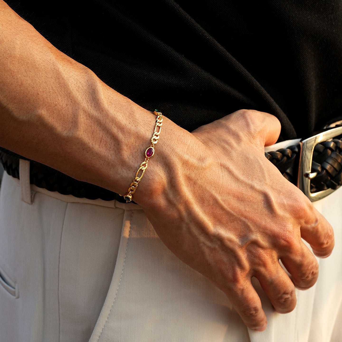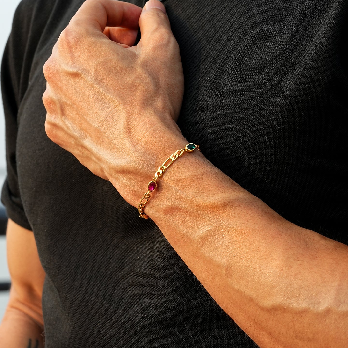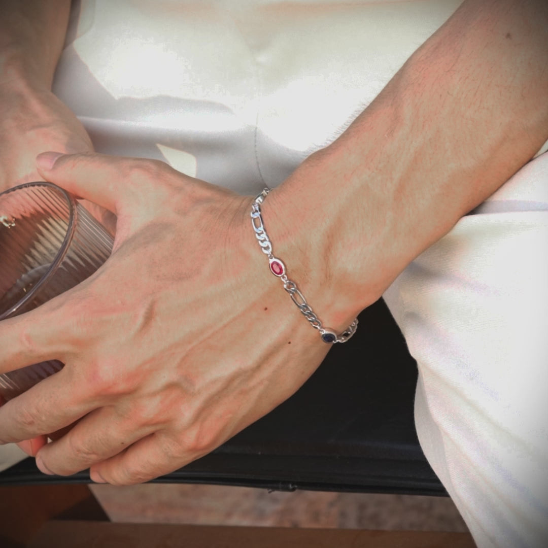 Inspired by the allure of iconic infinity stones, the 4 mm Infinity Gems Figaro Link Bracelet merges vibrant color with classic Figaro silver craftsmanship. Each bracelet is meticulously crafted from S925 sterling silver and set with five uniquely colored gemstones, representing individuality and power. Available in gold or white gold, this piece delivers a bold, contemporary aesthetic while maintaining refined elegance. Perfect for men seeking a statement accessory that balances strength, style, and sophistication