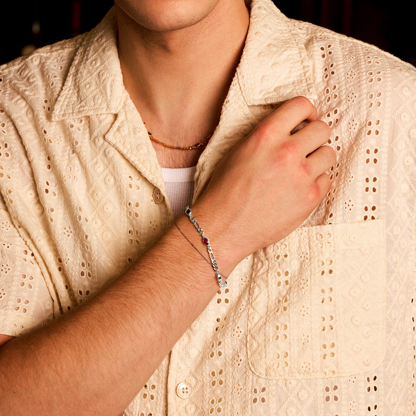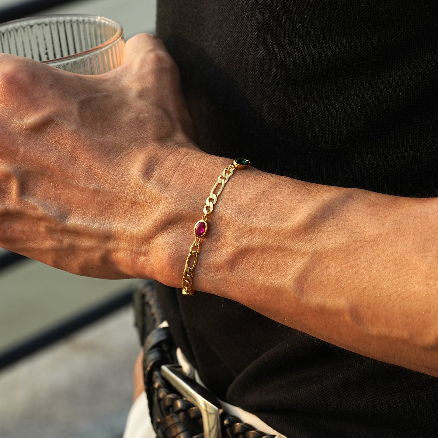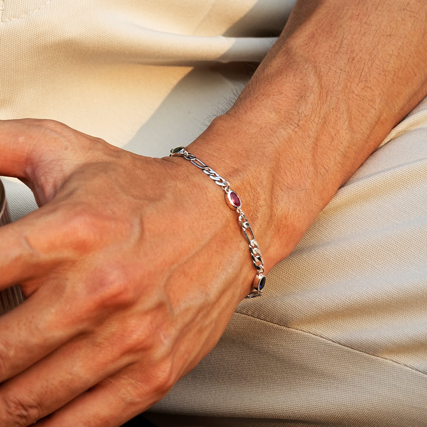Inspired by the allure of iconic infinity stones, the 4 mm Infinity Gems Figaro Link Bracelet merges vibrant color with classic Figaro silver craftsmanship. Each bracelet is meticulously crafted from S925 sterling silver and set with five uniquely colored gemstones, representing individuality and power. Available in gold or white gold, this piece delivers a bold, contemporary aesthetic while maintaining refined elegance. Perfect for men seeking a statement accessory that balances strength, style, and sophistication