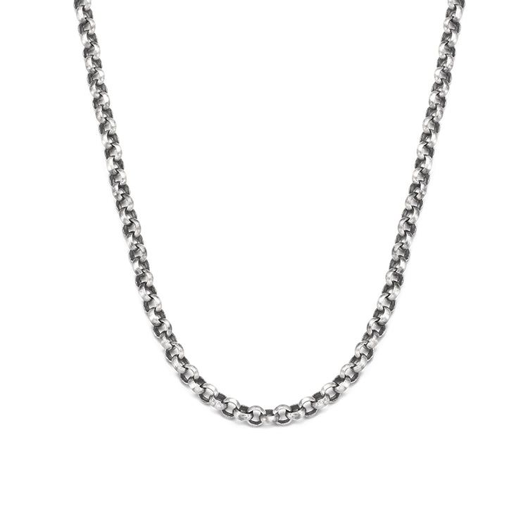 Available in oxidized silver, emphasizing depth and industrial character, or platinum tone, offering a clean, modern finish, this chain adapts effortlessly to different personal styles.