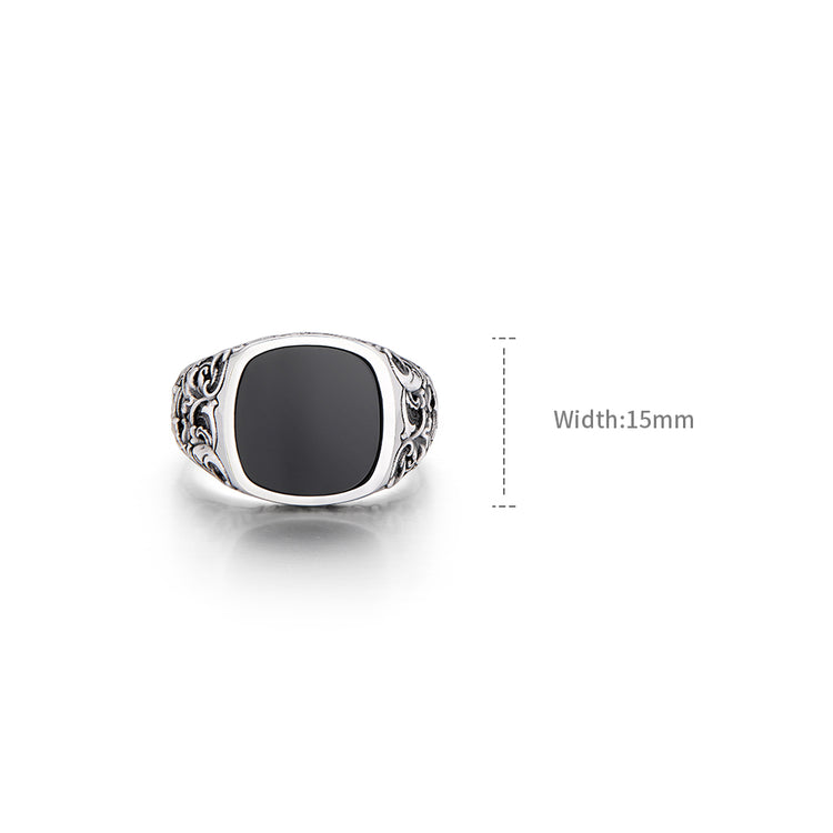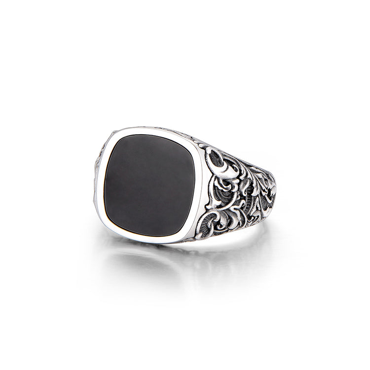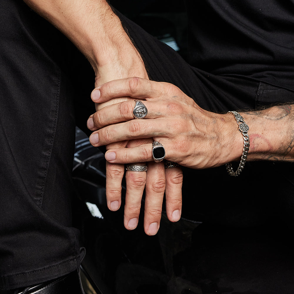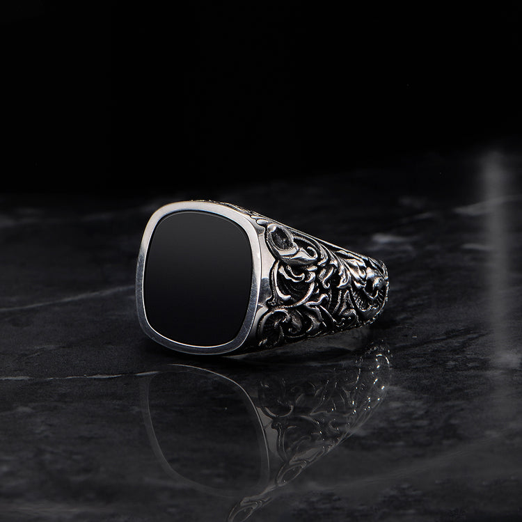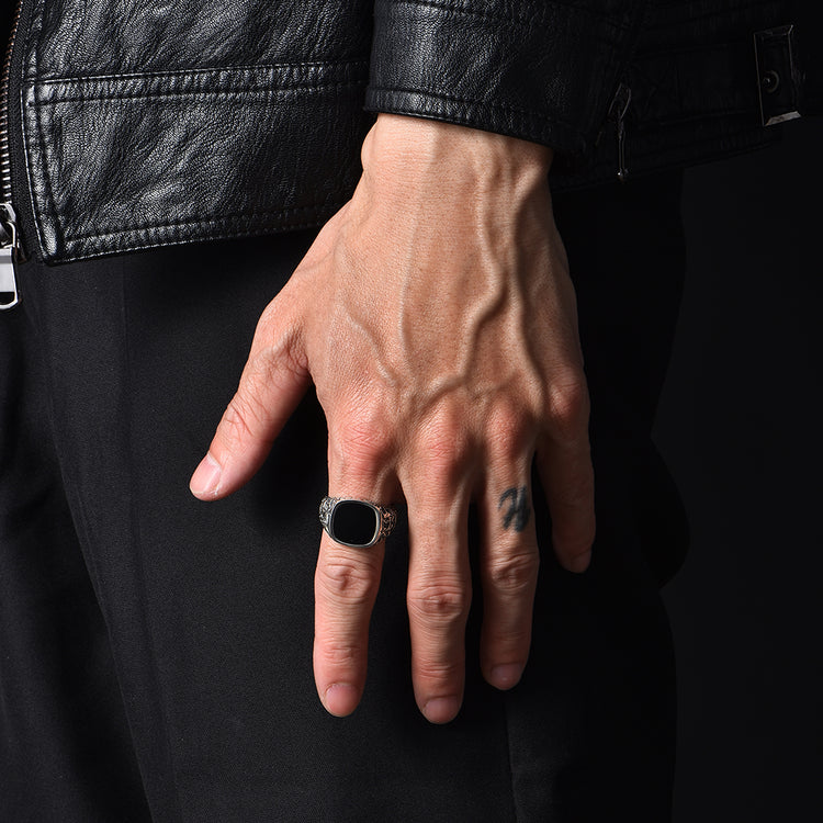 At the center sits a polished black onyx stone, cut into a smooth signet shape. Known for its grounding and protective qualities, black onyx brings both visual contrast and symbolic strength to the piece. Its dark, mirror-like surface provides a powerful focal point, balancing sophistication with bold masculinity.