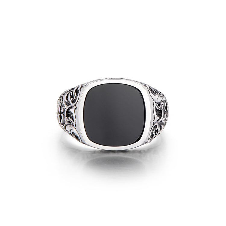 The Fleur-De-Lis Black Onyx Signet Ring is IDEAGEMER’s refined tribute to the timeless symbol of chivalry and noble lineage. Crafted from solid S925 silver, the ring features detailed fleur-de-lis engravings along the band, executed with a vintage oxidized finish to enhance depth and character. This classic motif, historically associated with courage, loyalty, and heritage, reinforces the wearer’s sense of identity and presence.