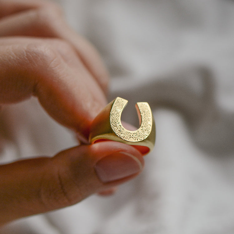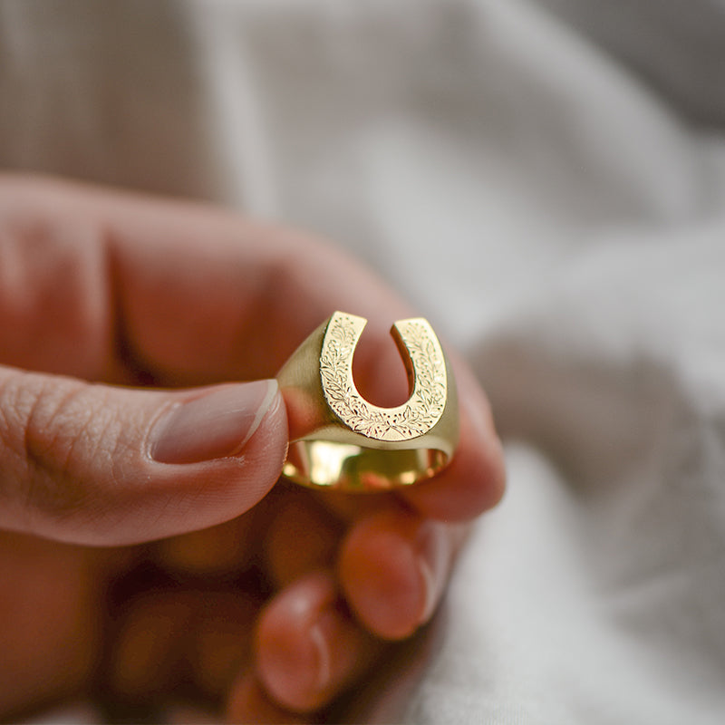 Forged from premium S925 Sterling Silver, this ring features a wide-profile horseshoe face that serves as a canvas for deep, manual engraving. Our master artisans hand-carve a continuous Victorian floral motif along the shoulders and face, ensuring that no two pieces are ever identical. The silver is treated with a light oxidation to make the intricate petals and leaves "pop" with three-dimensional depth. This deposit secures your place in our artisanal queue, beginning the transformation of raw metal into a personal relic.