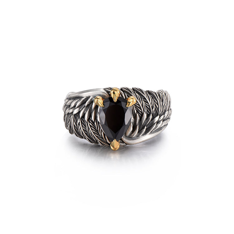 A refined ring framed by classic eagle-wing motifs, anchored by a deep black onyx stone for a bold yet timeless look.
