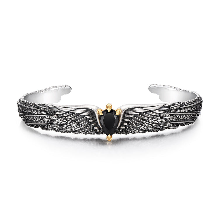 A structured bangle enriched with detailed eagle-wing engravings and a polished black onyx centerpiece, representing vision and resilience. -