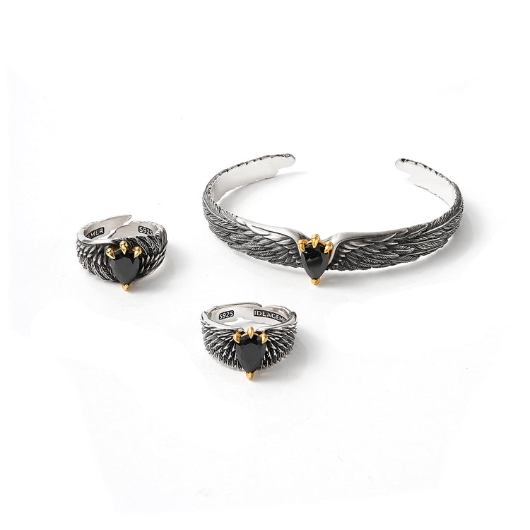 The Spirit Eagle Wings Gift Set channels the symbolism of strength, clarity, and forward momentum through three vintage-inspired designs. Featuring the Vintage Black Onyx Spirit Eagle Wings Bangle Bracelet, the Spiral Wings Ring, and the Eagle Wings Ring, this set merges sculptural wing motifs with the bold depth of natural black onyx. Together, they deliver an unmistakable statement rooted in power and heritage.