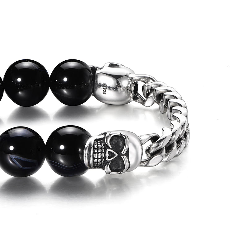 Smooth black obsidian beads form the main strand, their polished surfaces catching subtle glimmers of light with every movement. Around one-third of the bracelet, sterling silver beads are sculpted in a Cuban link pattern, punctuated with carved skull accents that contrast sharply against the dark stones. The combination of tactile beads, detailed metal, and gothic motifs gives the bracelet a dynamic rhythm, creating a bold yet wearable statement on the wrist.