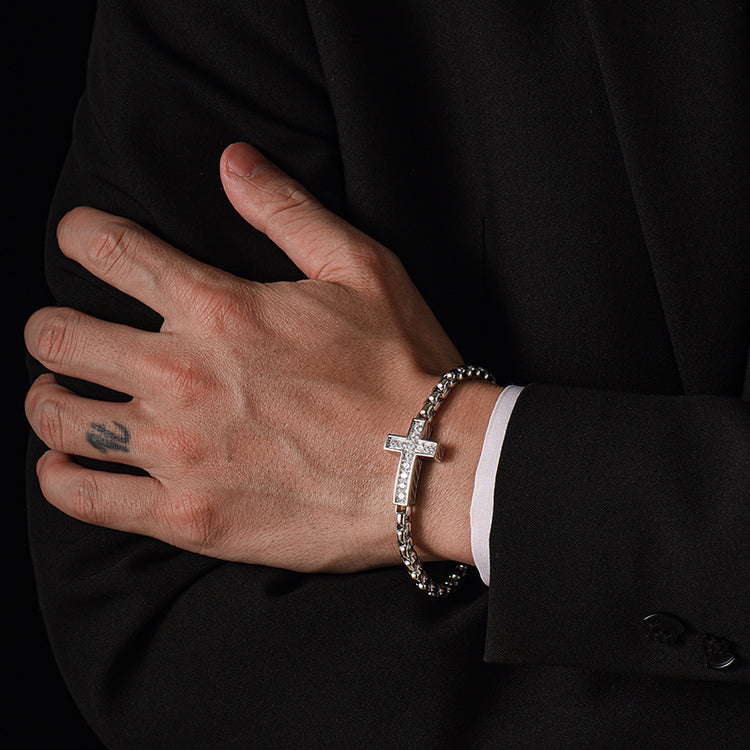 As a men’s sterling silver bracelet, it drapes naturally while maintaining structure and presence. The interplay of polished highlights and shadowed edges creates a tactile, refined piece that balances modern architecture with symbolic flair, making the Cross Box Chain Bracelet both versatile and statement-making.