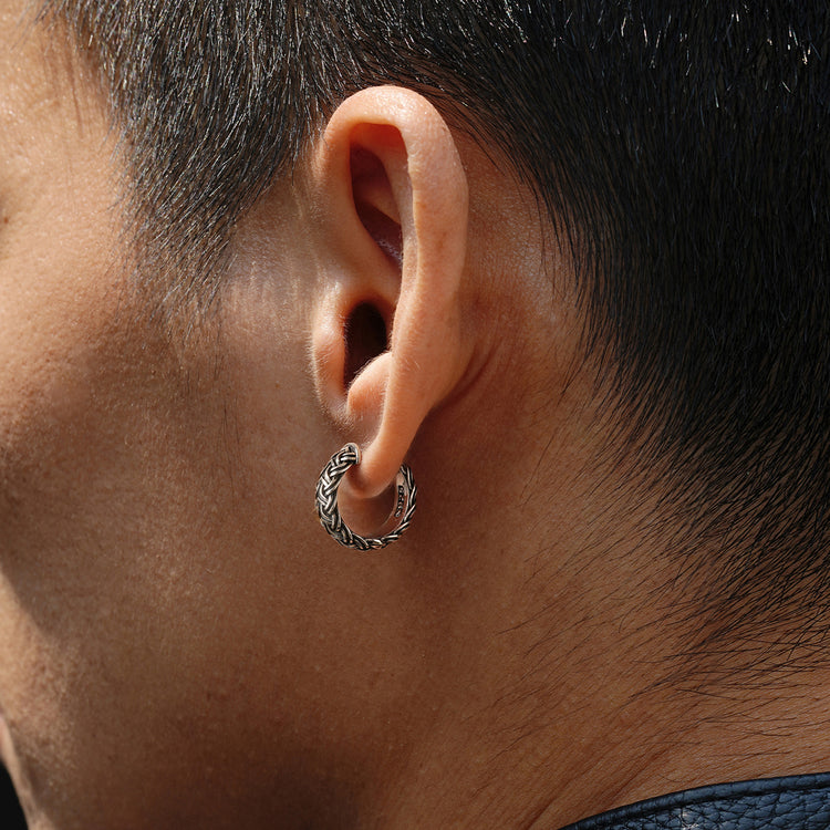 The braided motif makes these earrings versatile for everyday wear, pairing seamlessly with streetwear, minimalist fits, or rugged silver accessories. This piece elevates the classic hoop with a distinct texture and craftsmanship that stands out from mass-produced alternatives, making it a signature essential for men who appreciate meaning and detail in their jewelry.