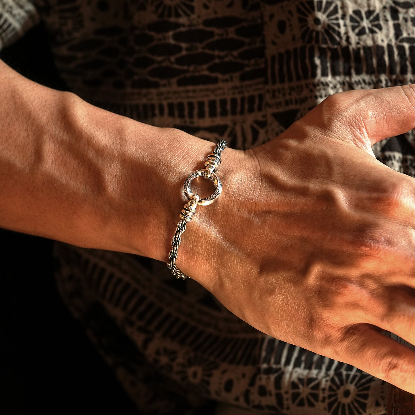 This contrast between movement and stillness reflects controlled power. The rope chain represents resilience and force, while the Möbius form embodies permanence and flow. Together, they form a bracelet that is both architectural and symbolic.
