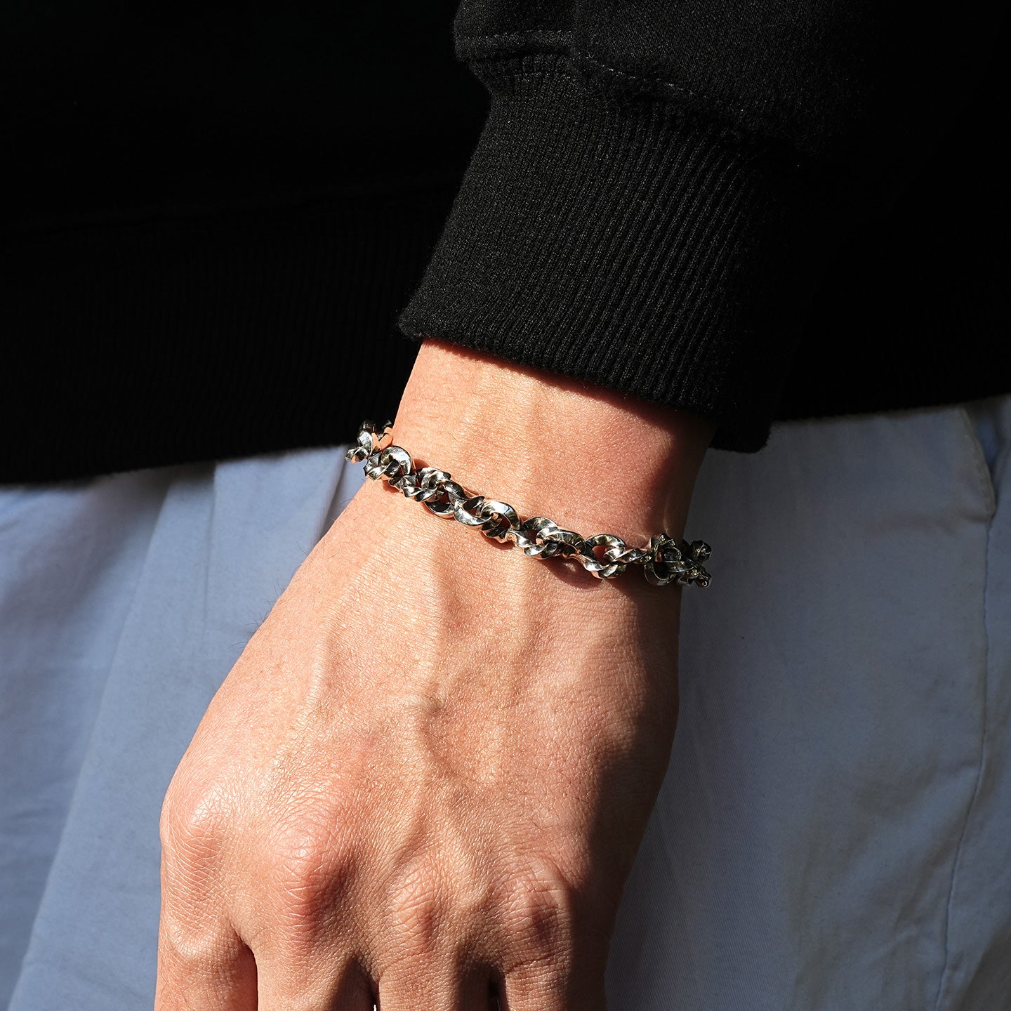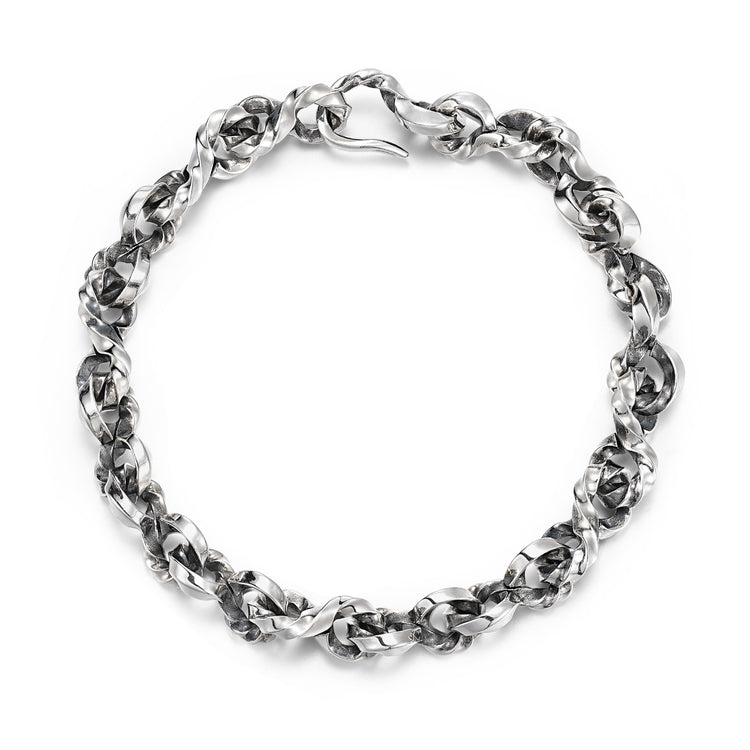 Crafted from solid sterling silver and finished with a darkened, oxidized patina, the bracelet carries a sense of time, permanence, and intellectual depth. The repetition of Möbius forms introduces rhythm and balance, while the aged finish adds character and restraint.