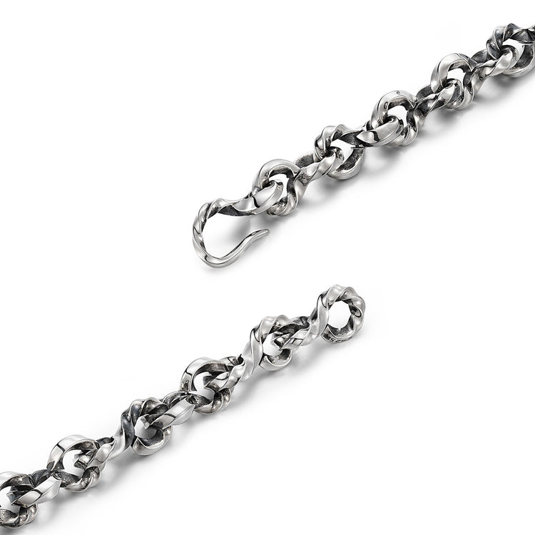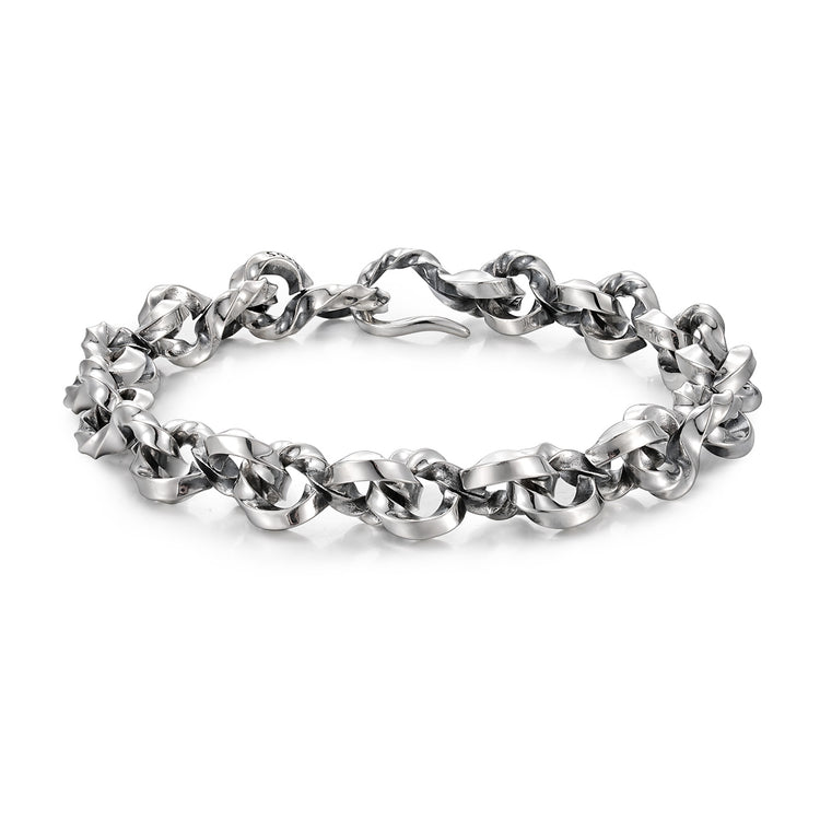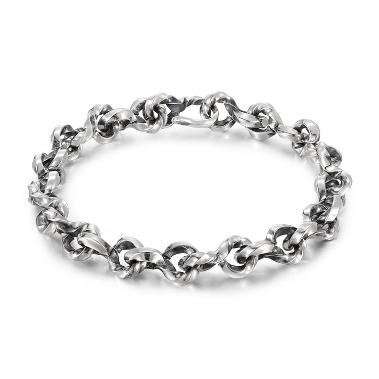 The Vintage Infinity Möbius Bands Chain Bracelet is inspired by the Möbius strip—a mathematical form defined by endless continuity and a single, unbroken surface. Each band in the chain follows this principle, linking together to create a structure without beginning or end.