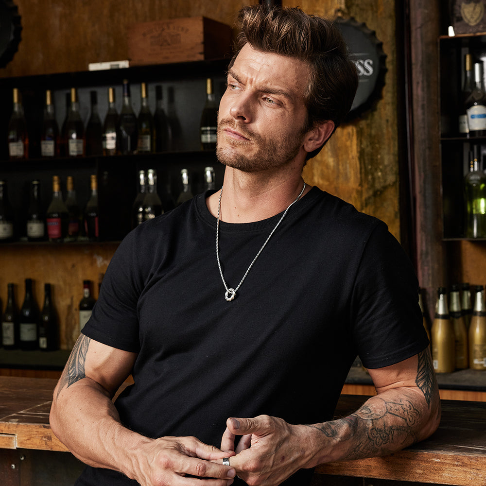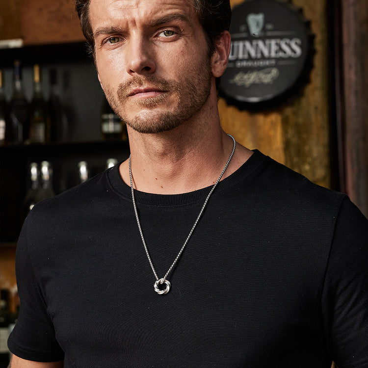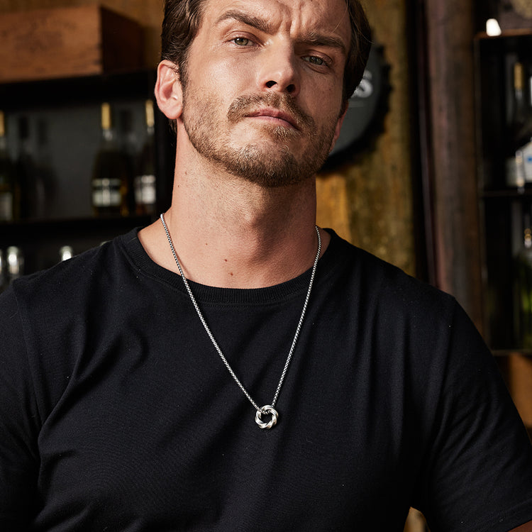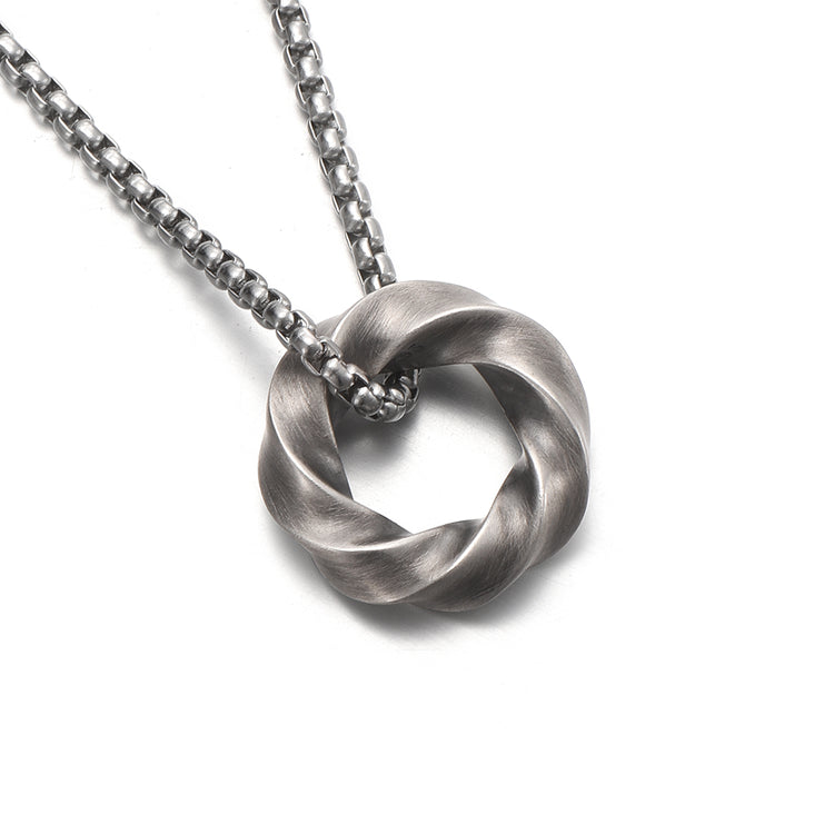 Sculpted into a smooth, twisted hoop, the pendant represents infinity, balance, and continuity, making it more than an accessory — it is a quiet statement of permanence and inner strength. The subtle twist adds depth and movement, while the vintage-inspired finish delivers a refined, masculine character.