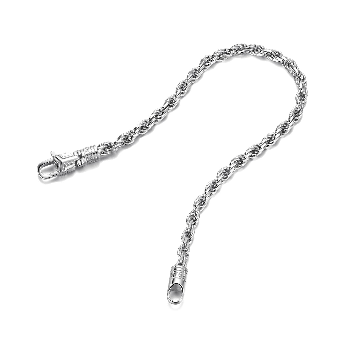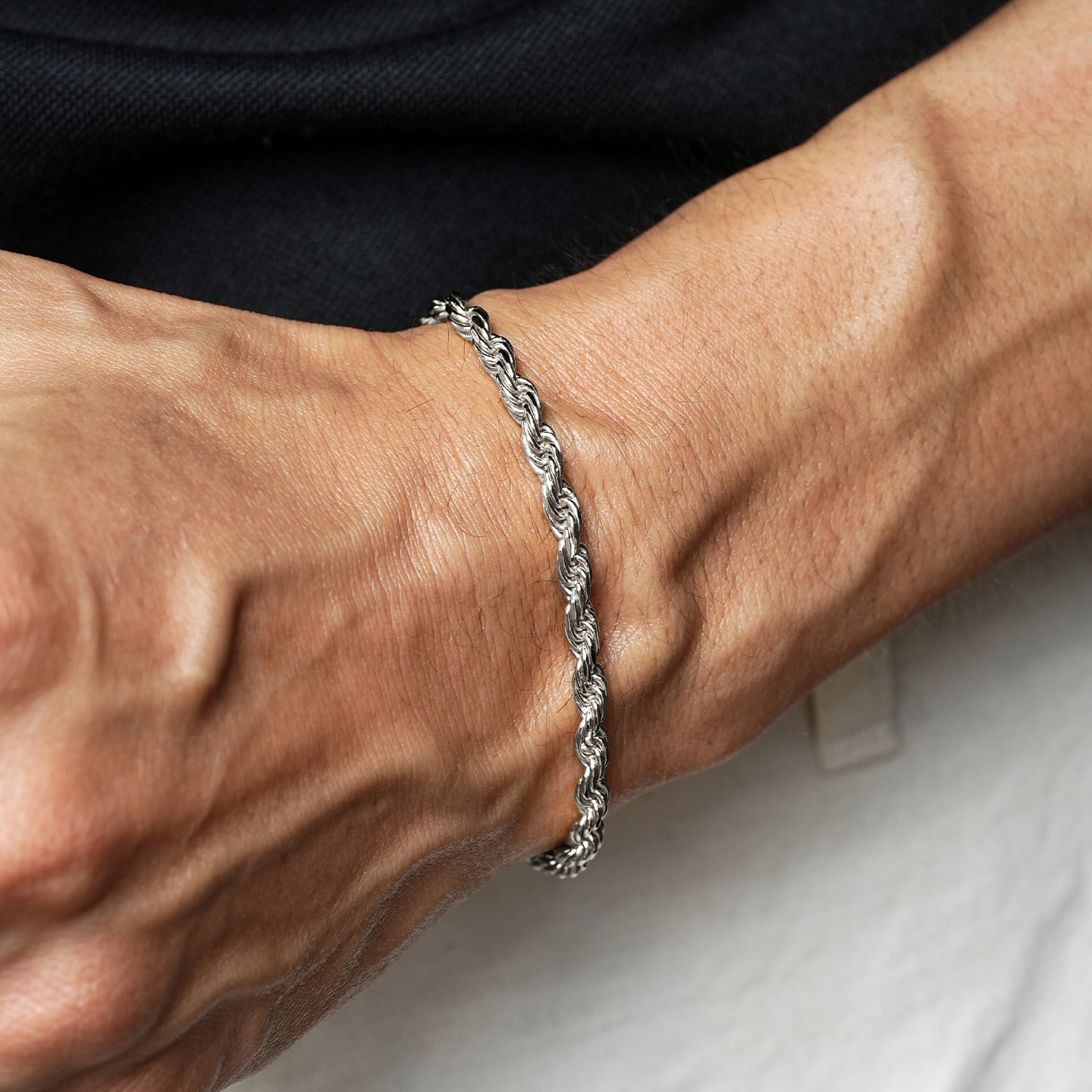 Finished in solid silver and available in platinum or gold tones, the bracelet balances weight, structure, and precision. Every detail is intentional — from the tactile density of the rope chain to the architectural clarity of the clasp.