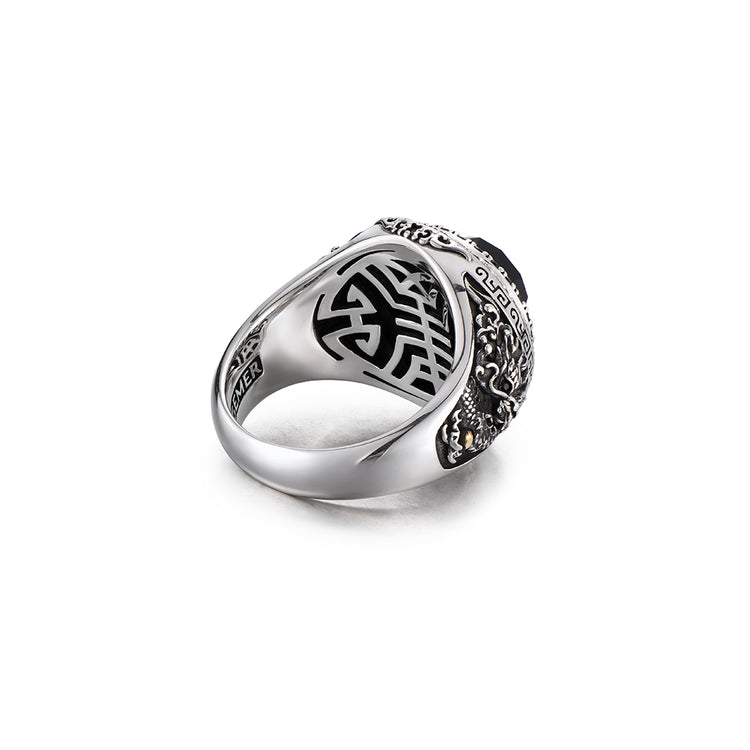 The band is sculpted with eastern dragon engravings, captured mid-roar with piercing eyes and clawed strength. Each dragon grasps a golden orb — a traditional symbol of wisdom, dominance, and guarded power.