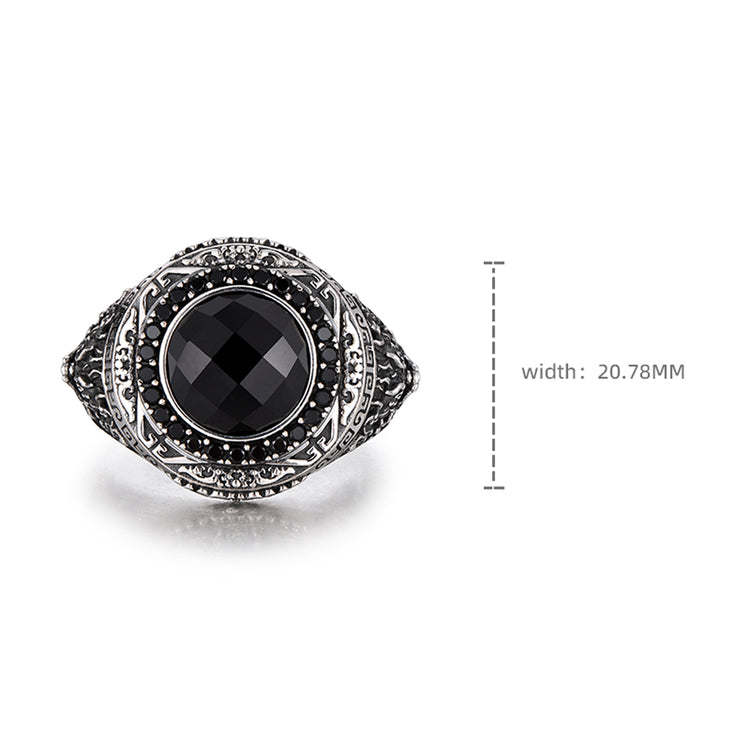Crafted from solid sterling silver with a subtly oxidized finish, the ring features a large round black onyx stone with a faceted diamond-pattern surface, framed by black zircon detailing for added depth and contrast.