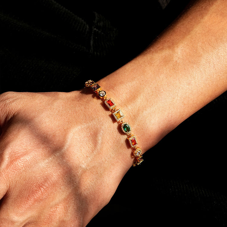 Crafted from solid sterling silver and finished in rich gold vermeil, this bracelet is set with multi-colored zircon gemstones in varying shapes and sizes. Each stone represents a moment — different, imperfect, yet intentionally placed.