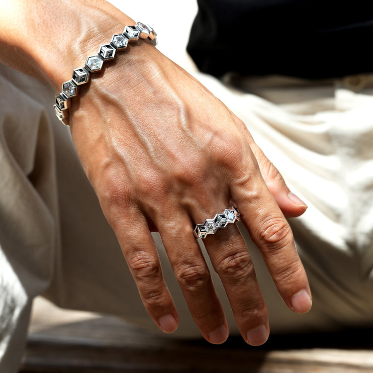 The Iced Hexagon Armor Ring draws inspiration from modern armor and mountain-forged geometry. The hexagon — a symbol of structural strength and balance — is echoed throughout the design, from the precision-cut zircon stones to the layered armor-like engravings along the band.