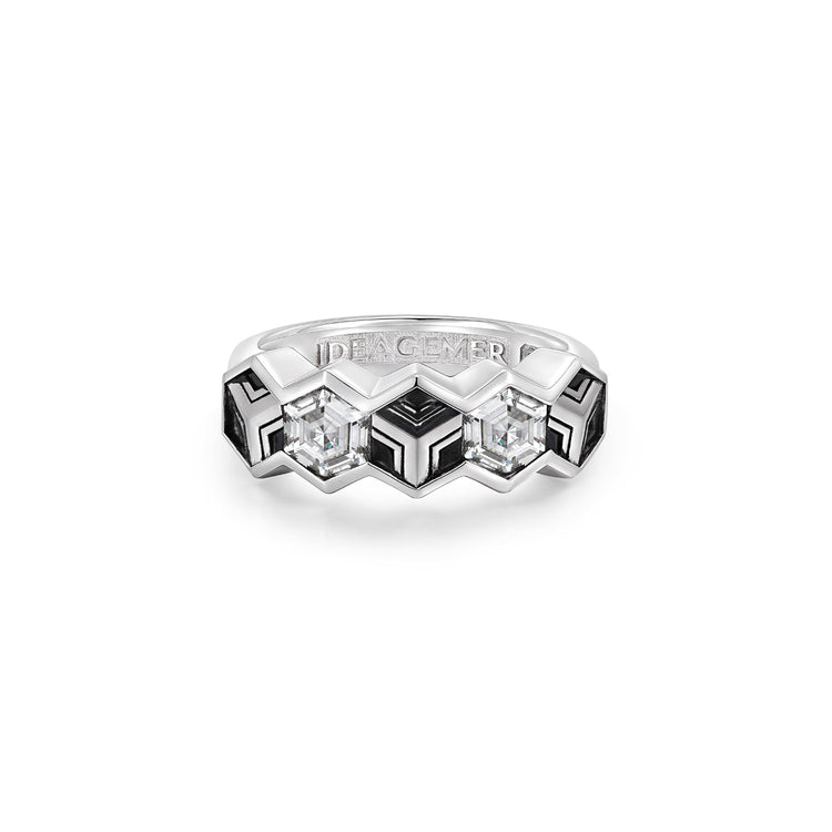 Crafted from solid sterling silver, the ring features a subtle oxidized finish that enhances contrast and depth, giving it a refined iced appearance. The geometric form is deliberate, engineered to project strength without excess.