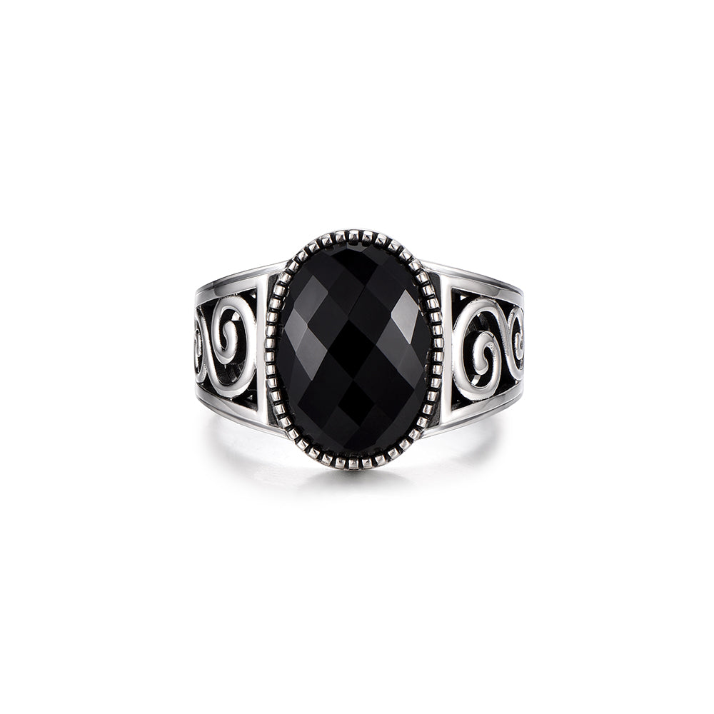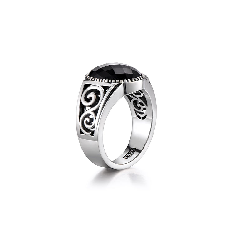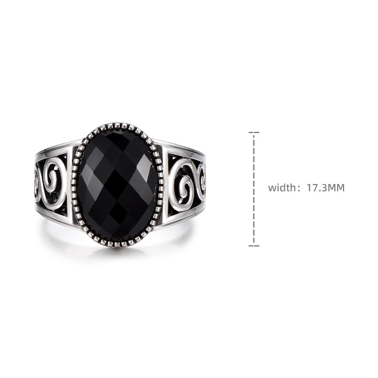 Crafted from solid sterling silver with a lightly oxidized finish, the ring features a large oval black onyx stone with a faceted diamond-pattern surface, creating depth and subtle reflection under light.