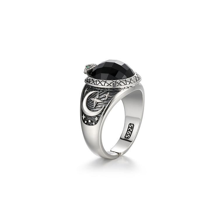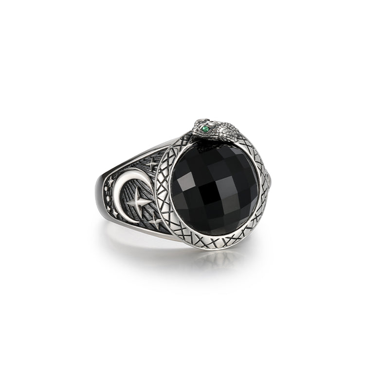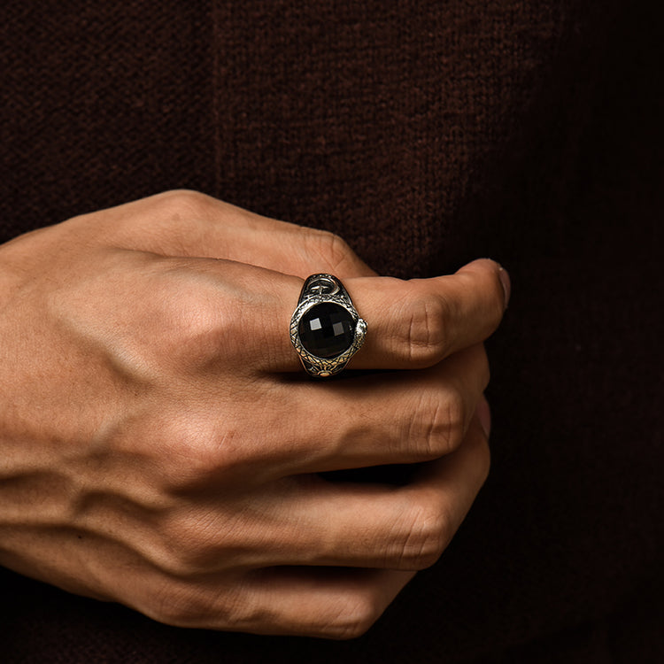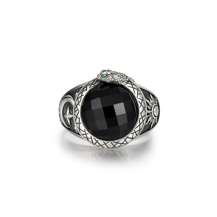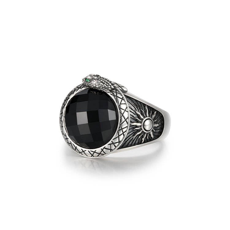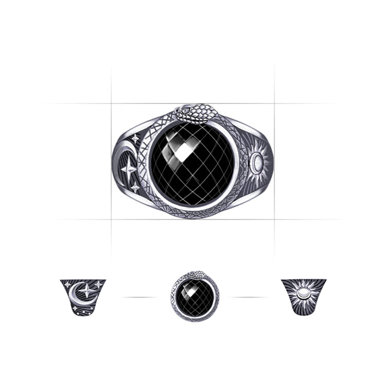 A sculpted serpent coils around the onyx, symbolizing rebirth, awareness, and controlled strength. On each side of the band, sun and moon engravings represent duality — light and shadow, action and restraint.