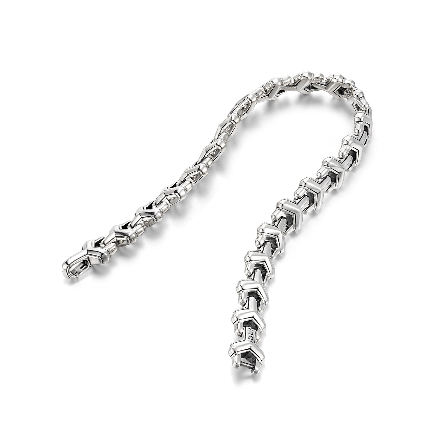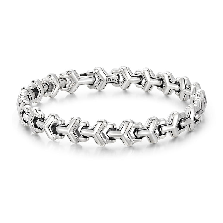 A single row of armor-inspired links encircles the wrist, each surface catching light with subtle reflections that shift as the hand moves. The smooth yet structured links convey strength without excessive bulk, while the polished edges contrast against the slightly textured surfaces, giving the bracelet a refined, tactile character.