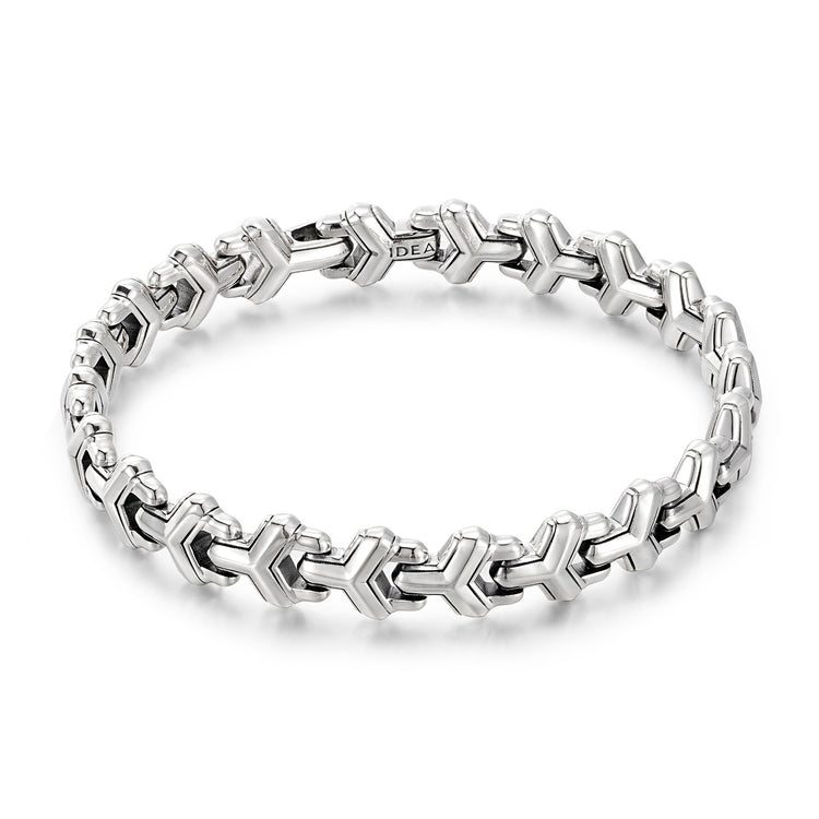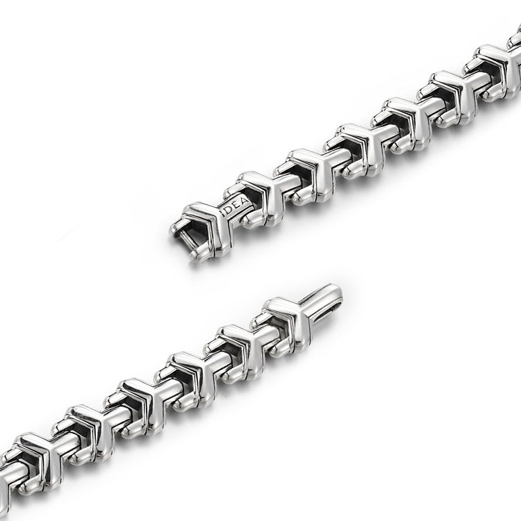 Built from sterling silver with gold vermeil accents, the bracelet exudes a grounded weight and balanced presence. Its clean geometric links, subtle vintage texture, and sharp edges reflect New York designer aesthetics while honoring London heritage craftsmanship, creating a versatile piece that commands attention without overwhelming the wrist.