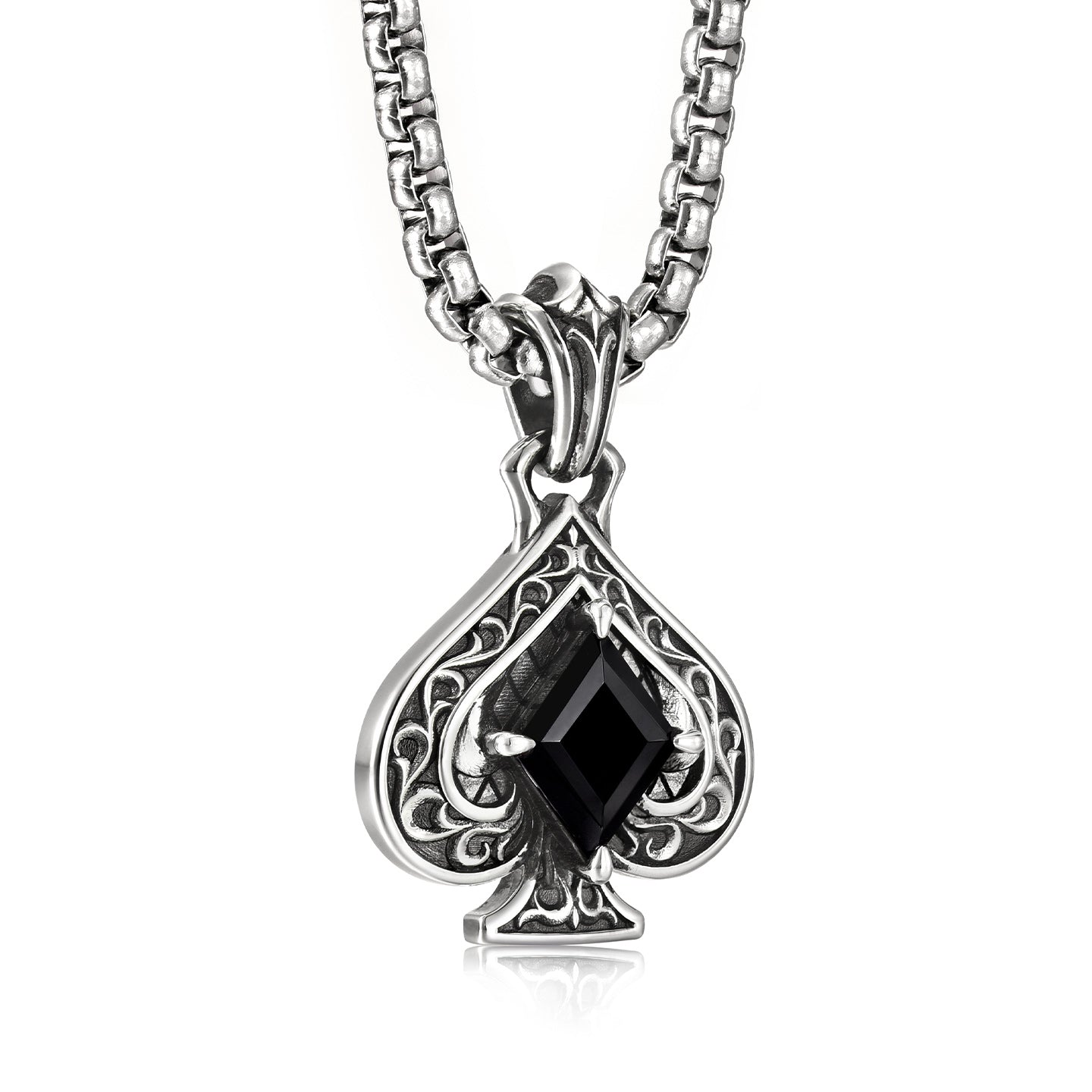 Meticulously forged from Solid S925 Sterling Silver, the pendant features a high-relief spade frame filled with intricate, medieval-inspired scrollwork. The central lozenge-cut Black Zircon is held in a secure four-prong setting, creating a deep, light-absorbing focal point. The silver is treated with a hand-applied antique oxidation to enhance the depth of the filigree and provide a weathered, "Old Money" aesthetic. It comes paired with a heavy-duty 2.5mm stainless steel box chain, secured by an ornate, flared bail for a seamless, balanced hang.