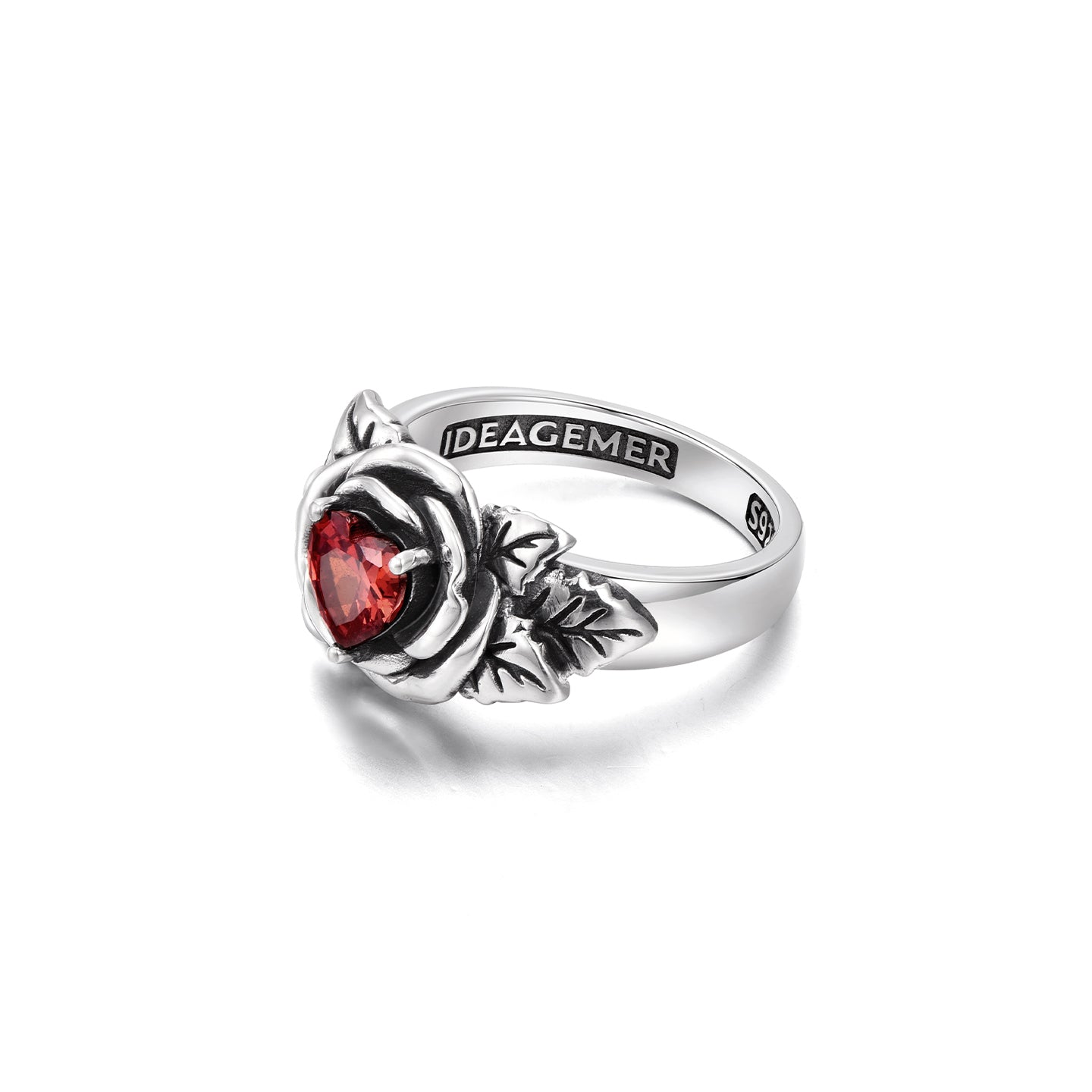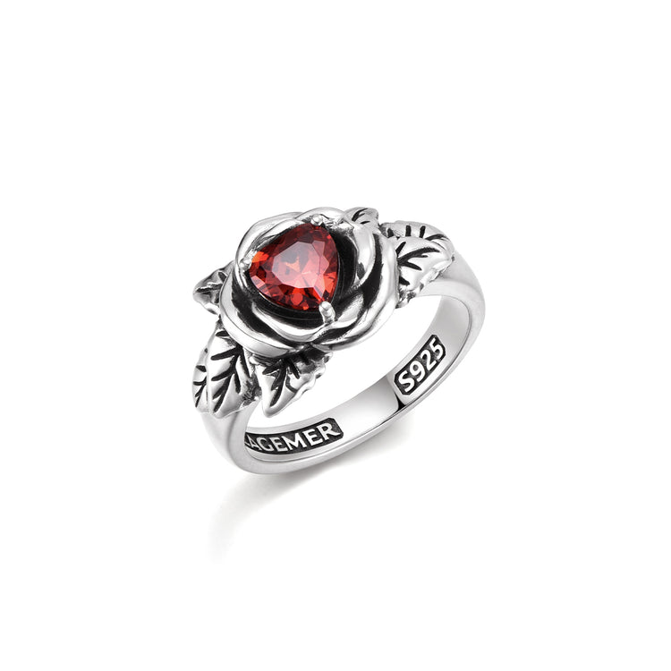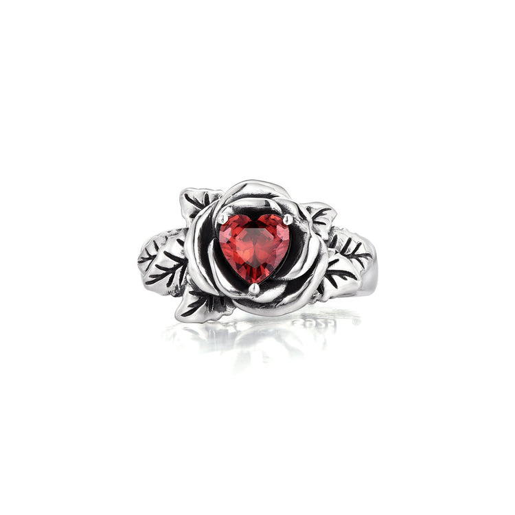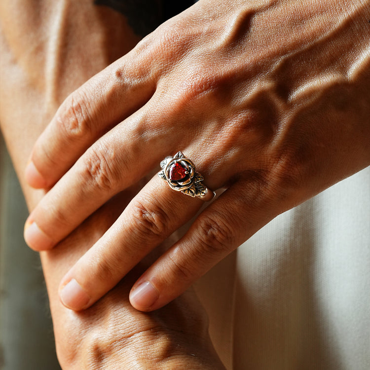 At its center sits a red heart-shaped zircon, adding emotional depth and contrast to the oxidized sterling silver body. Designed as a unisex statement ring, this piece balances romance and edge, making it equally powerful worn alone or paired with other vintage-inspired silver jewelry.