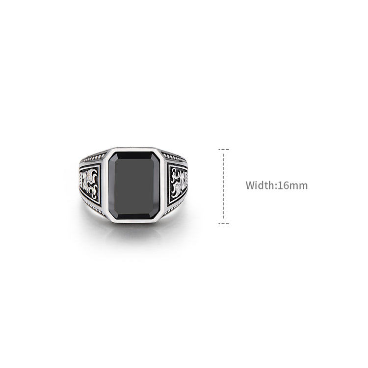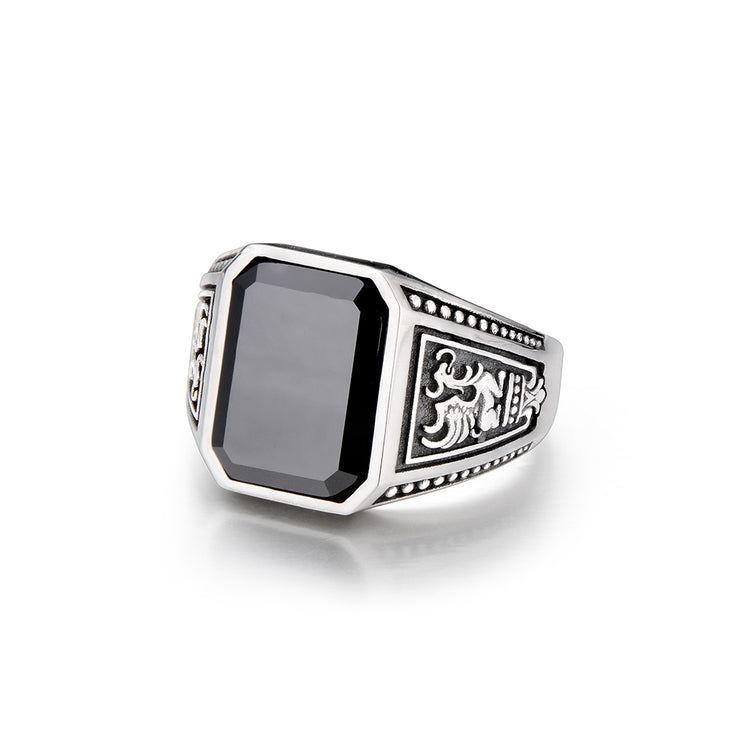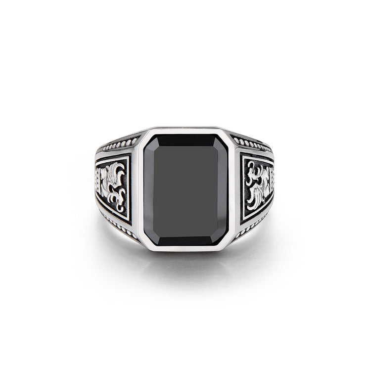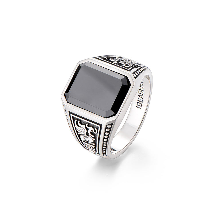 Crafted in oxidized sterling silver, the ring centers around a rectangular step-cut black onyx — a stone long associated with protection, authority, and inner strength. Its deep, mirror-like surface creates a stark contrast against the aged silver frame, reinforcing a sense of gravity and presence.