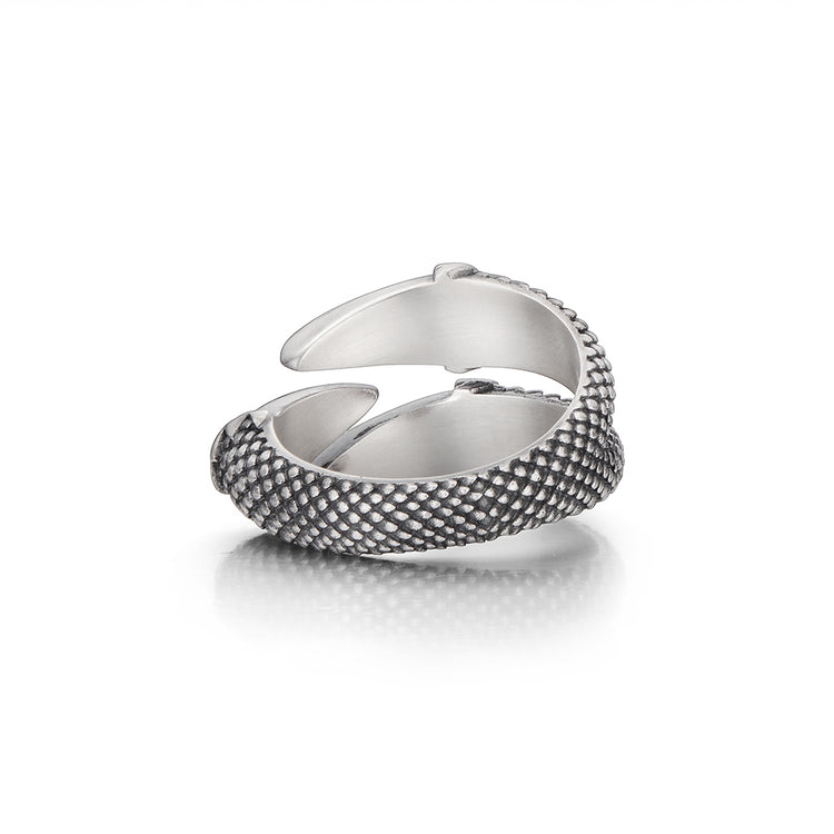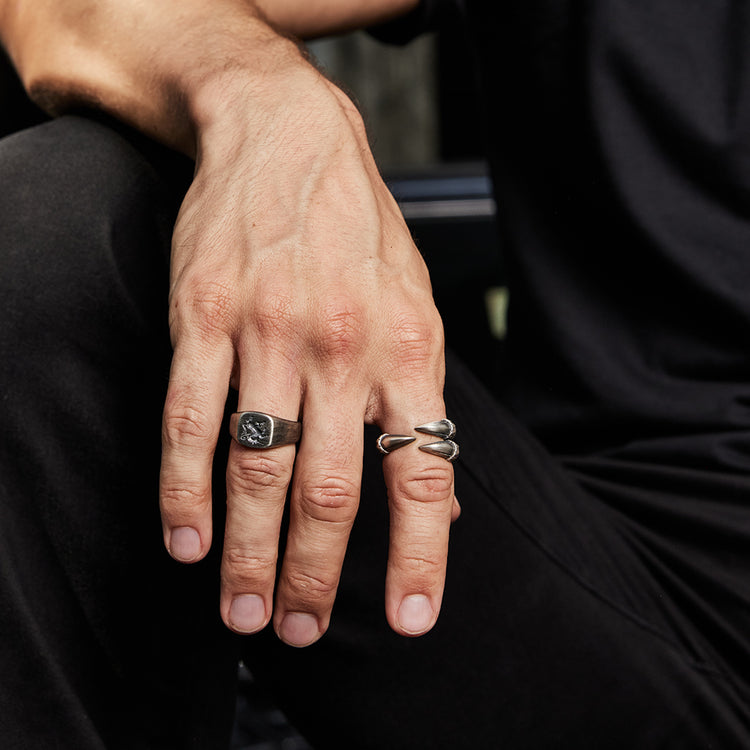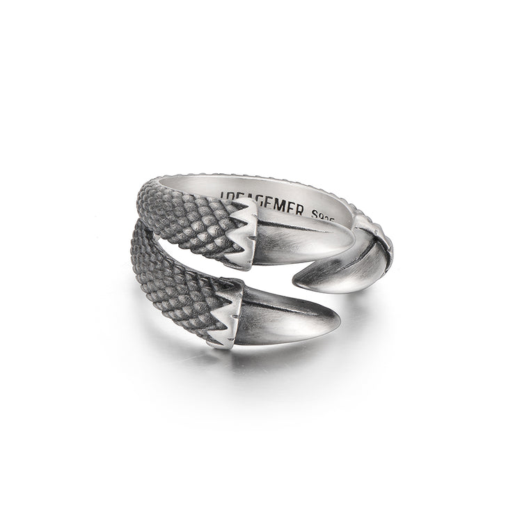 Each claw curves inward with a raw, organic flow, capturing the moment of a dragon’s grasp. The surface is finished with a vintage oxidized texture, enhancing depth and emphasizing every scale-like detail. Crafted from solid sterling silver, the ring carries substantial weight and presence on the hand.