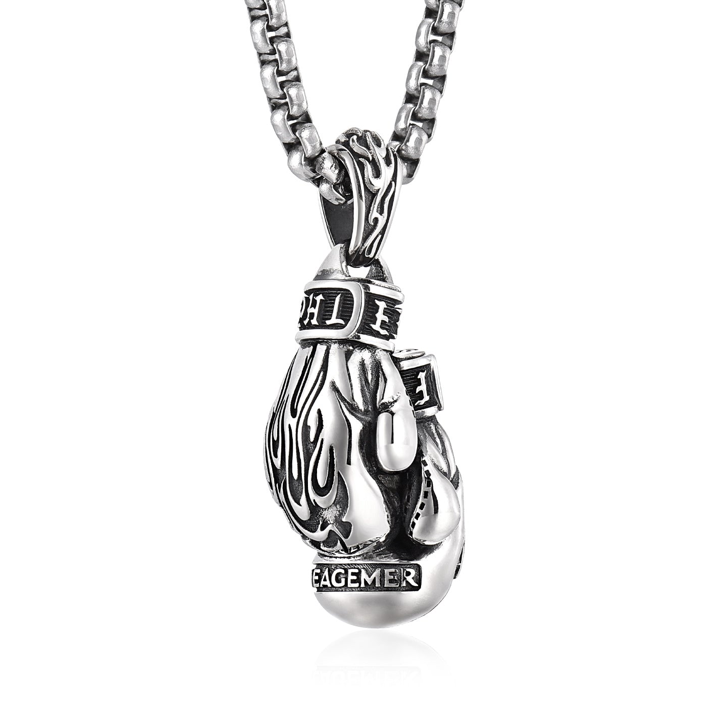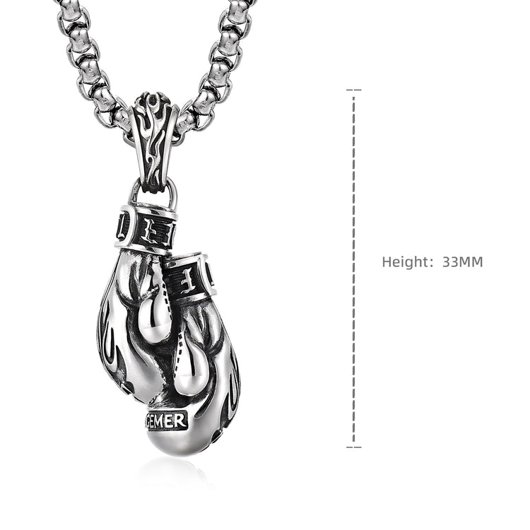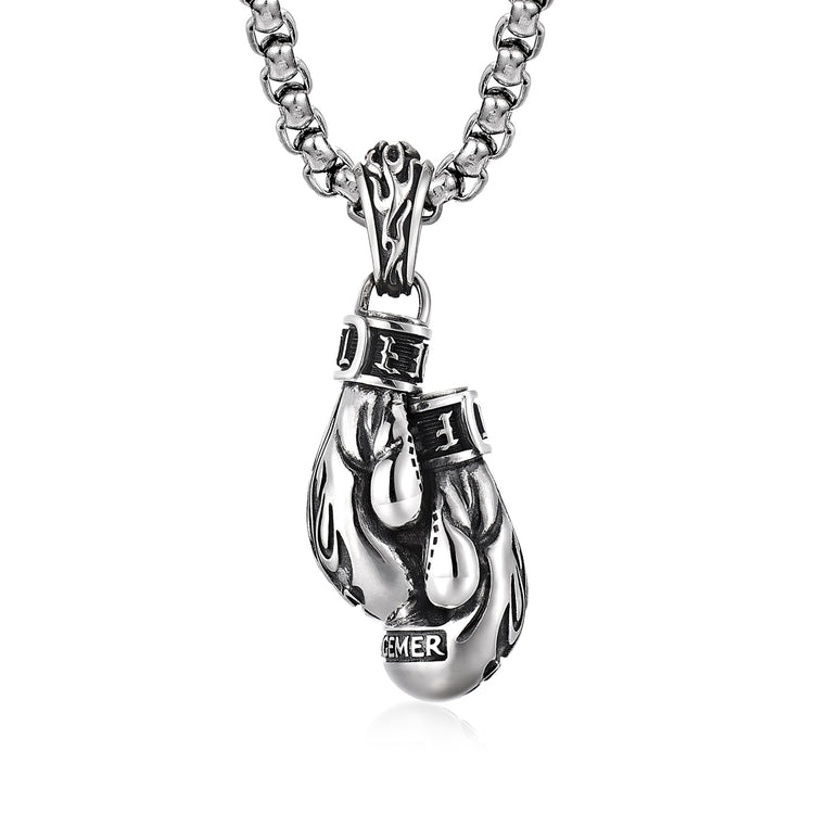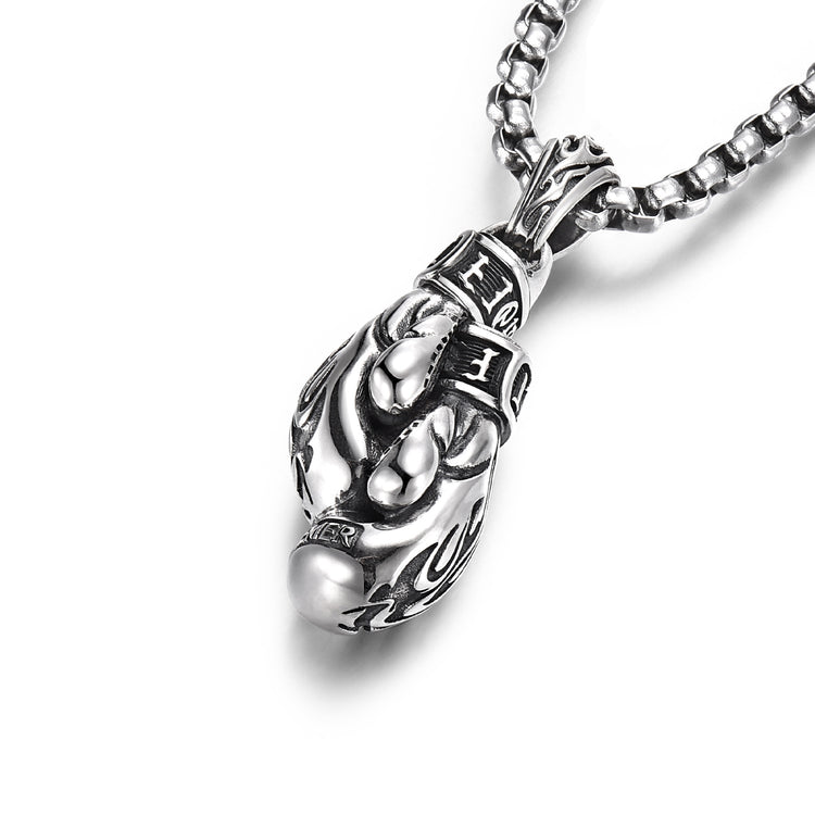 This three-dimensional pendant is crafted in the form of a classic boxing glove, symbolizing discipline, endurance, and the will to stand your ground. The sculpted flame engravings on the back represent inner fire — the relentless drive that keeps you moving forward, even under pressure.