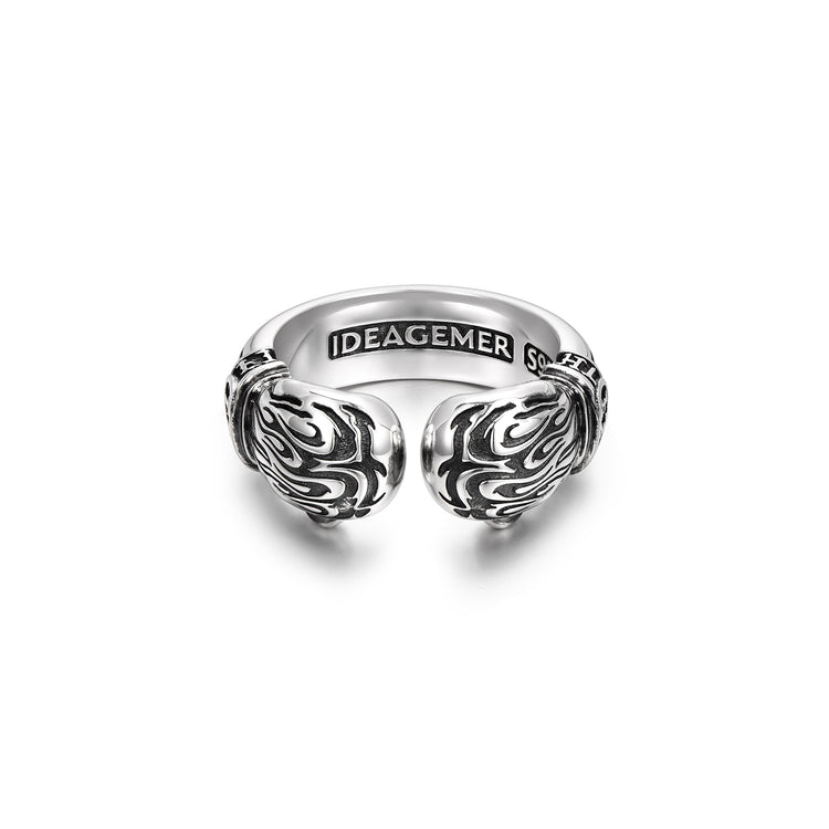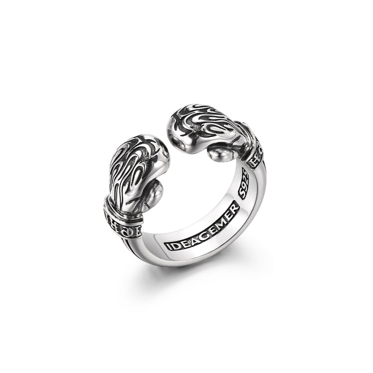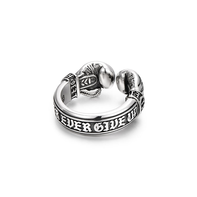 This bold silver ring features two sculpted boxing gloves positioned at each end, creating a striking open-ended design that symbolizes confrontation, balance, and readiness. The dual-glove structure represents both offense and defense — knowing when to strike and when to hold your ground.