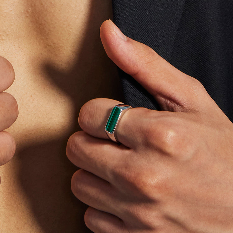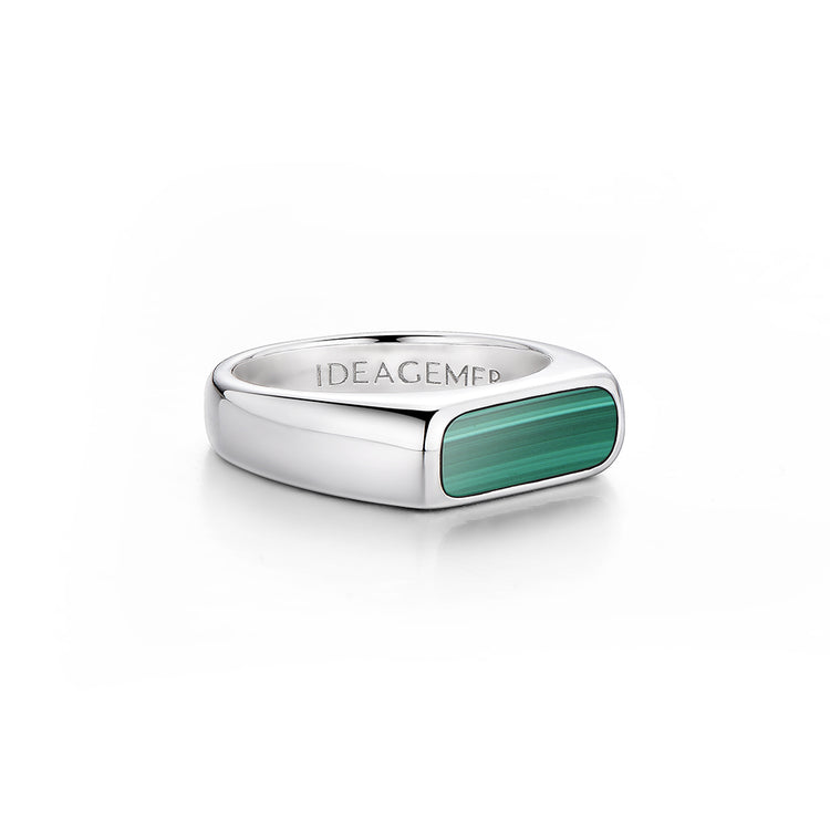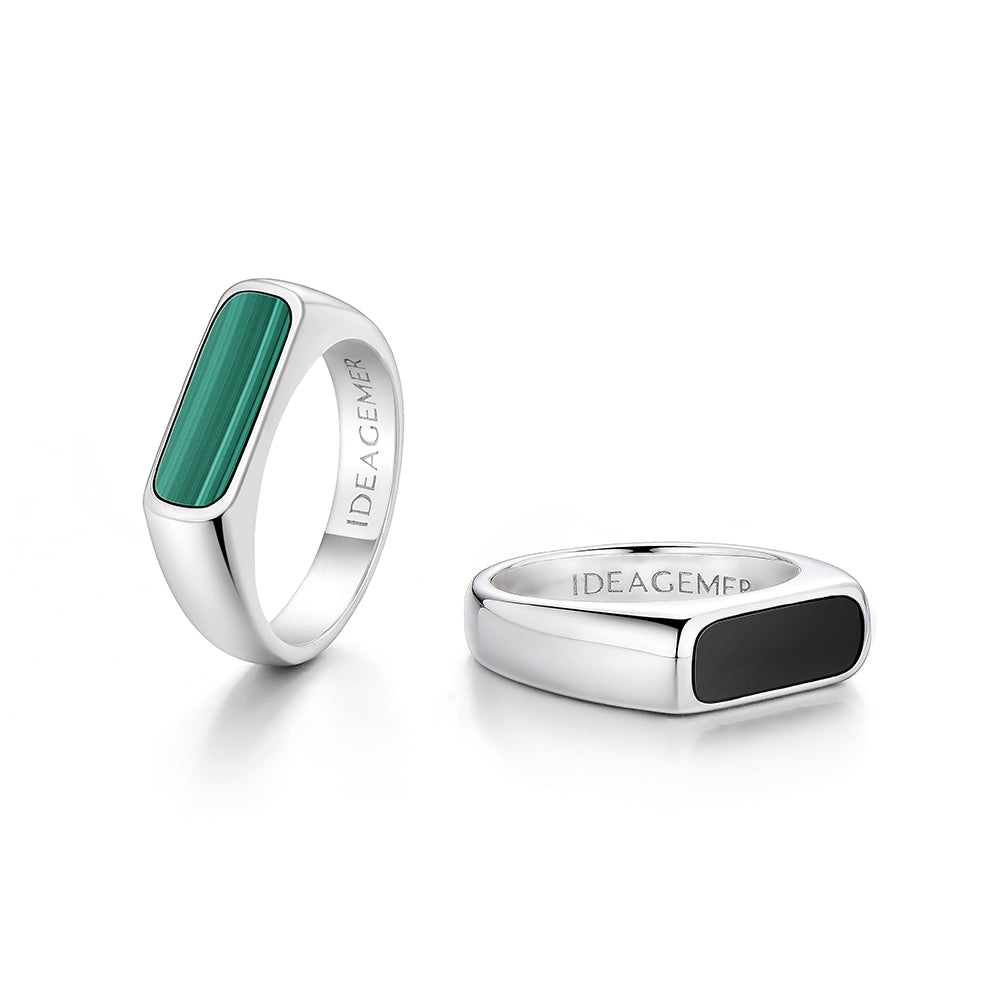 The Gem Bar Signet Ring reinterprets classic signet design through a modern minimalist lens. Featuring a sleek, elongated bar with softly rounded edges, the ring is set with your choice of black onyx or malachite—each stone offering a distinct expression of understated strength.