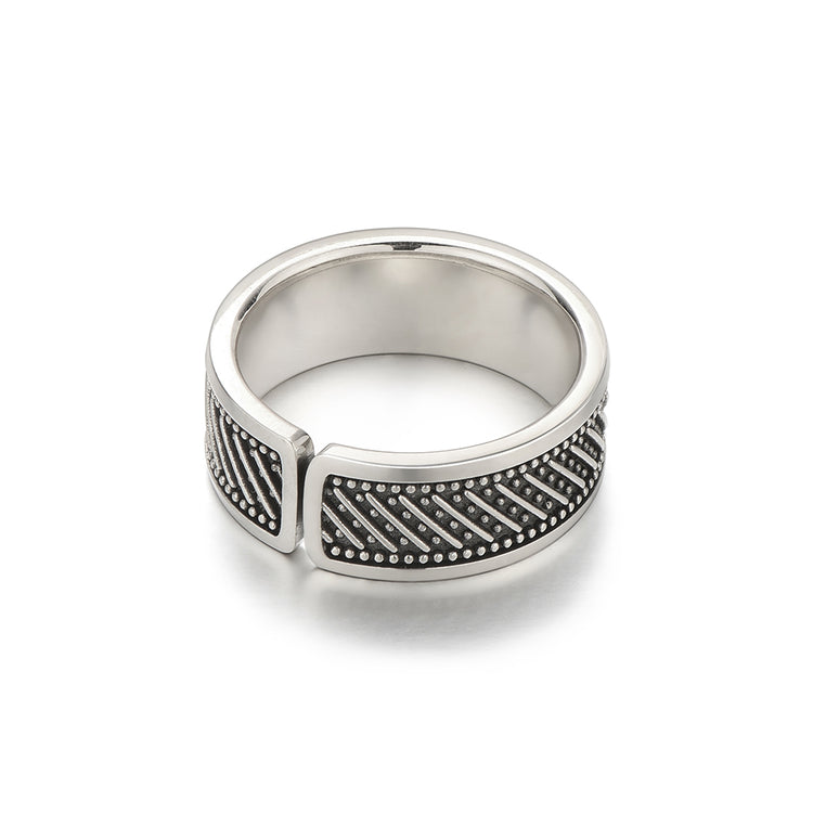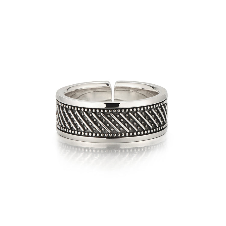 Crafted from solid 925 sterling silver, the Vintage Points & Lines Ring Band brings timeless character to men’s jewelry. Its oxidized finish highlights the unique combination of dots and diagonal lines, creating a bold vintage style. Designed for men who value individuality and strength, this sterling silver band ring is a versatile piece for daily wear or statement looks.