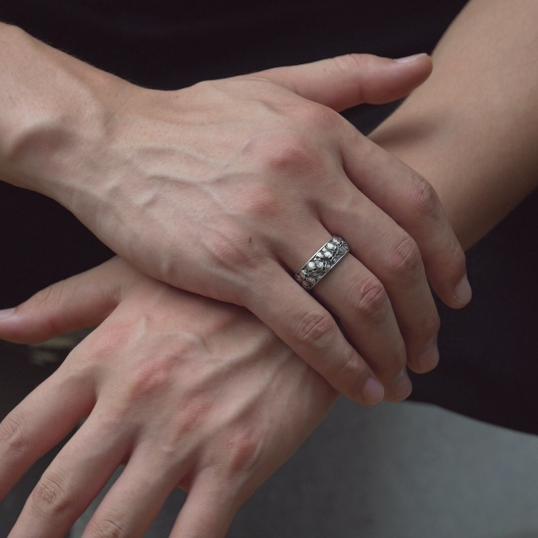 A procession of miniature skulls wraps the band, each carved with vintage precision and shadowed detail. Light plays along the raised contours, highlighting hollow eyes and polished teeth, creating a subtle rhythm of reflection and darkness as the hand moves. The ring feels alive, a tactile embodiment of gothic storytelling rather than mere ornamentation.