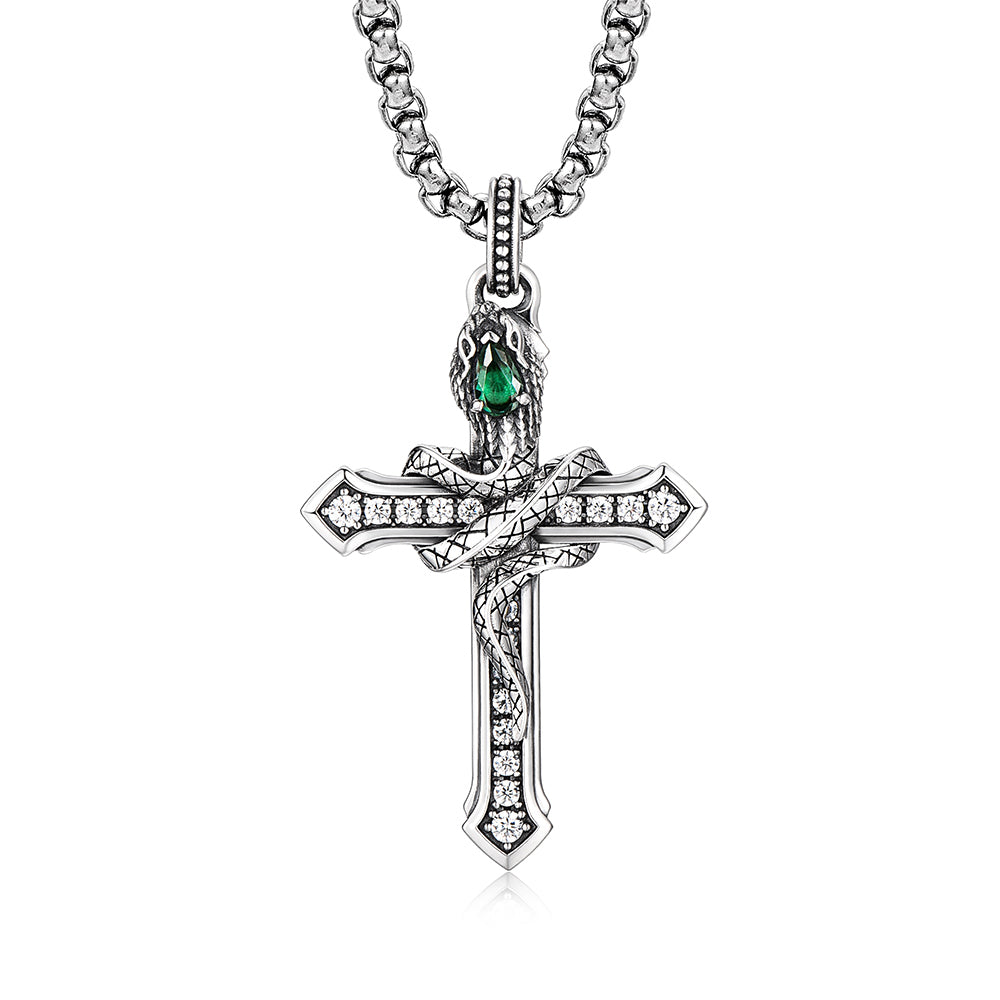A striking cross pendant wrapped with a serpent motif, highlighted by emerald accents that symbolize renewal and inner clarity. -