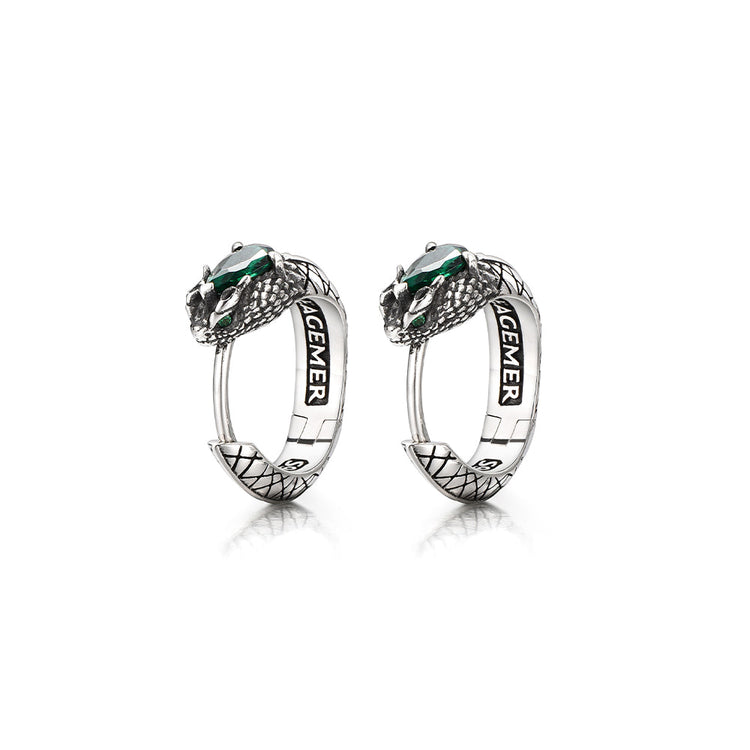 Hoop earrings sculpted with subtle serpent textures and finished with emerald embellishment for a balanced blend of attitude and refinement.