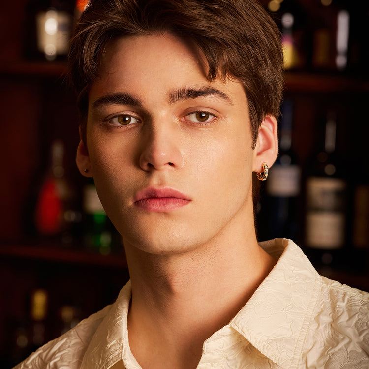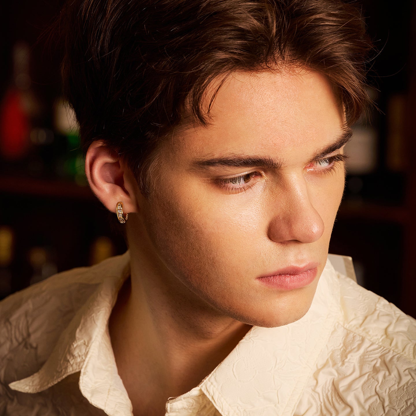 The Iced Golden Armor Hoop Earrings redefine the essence of strength through geometry and brilliance. Drawing from IDEAGEMER’s Armor heritage, this design combines interlocking hexagonal links with the signature mountain ridge (shan-wen-jia) motif, forming a seamless structure that speaks of protection, precision, and masculine poise.
