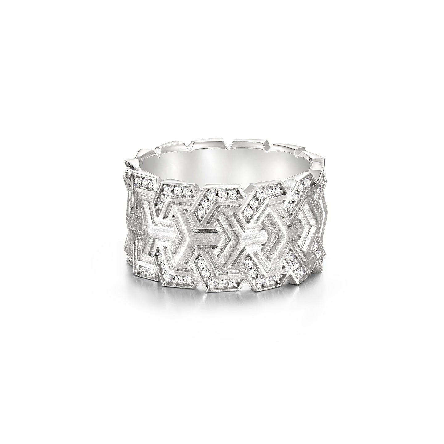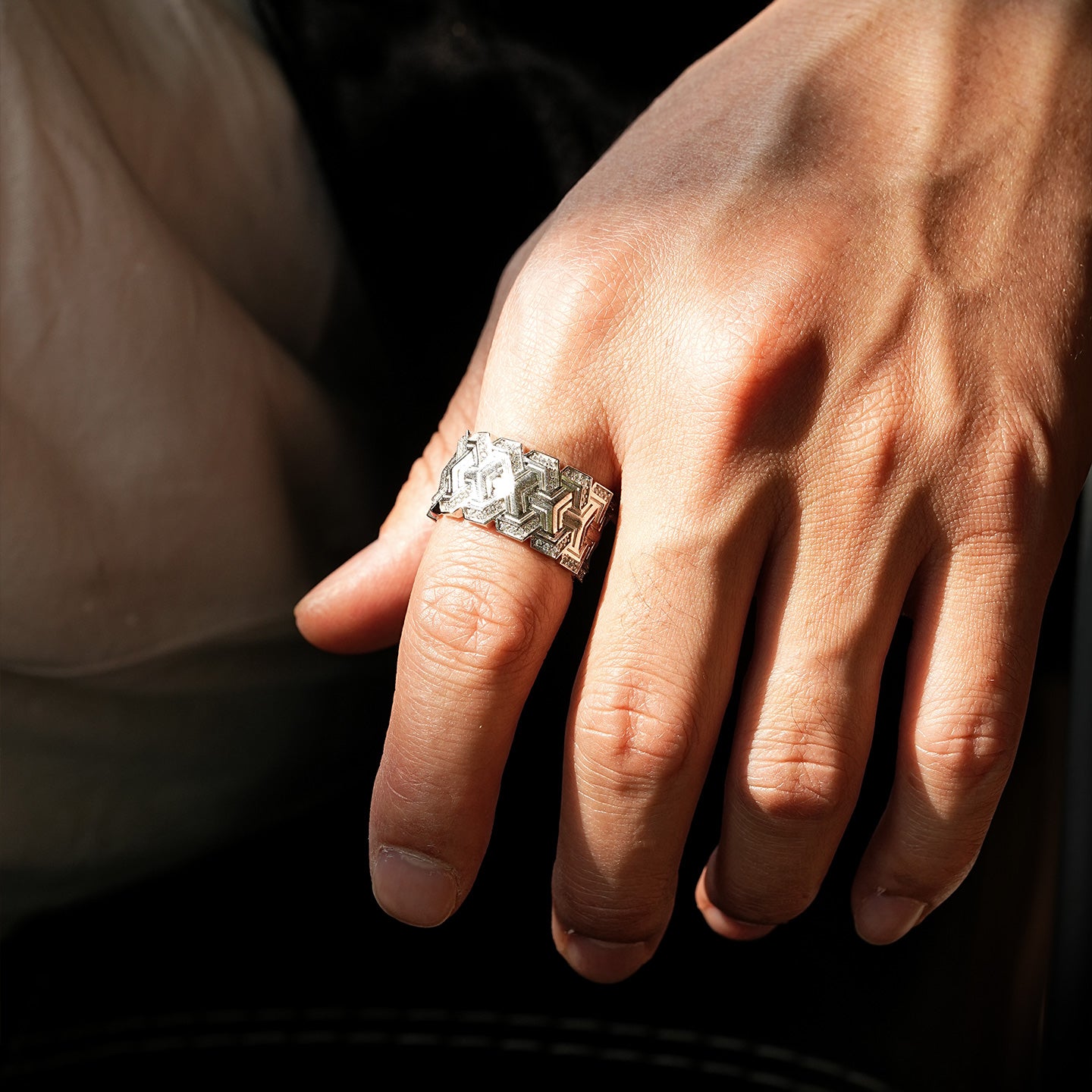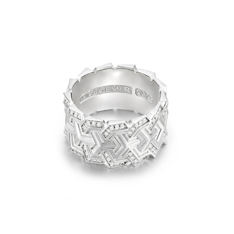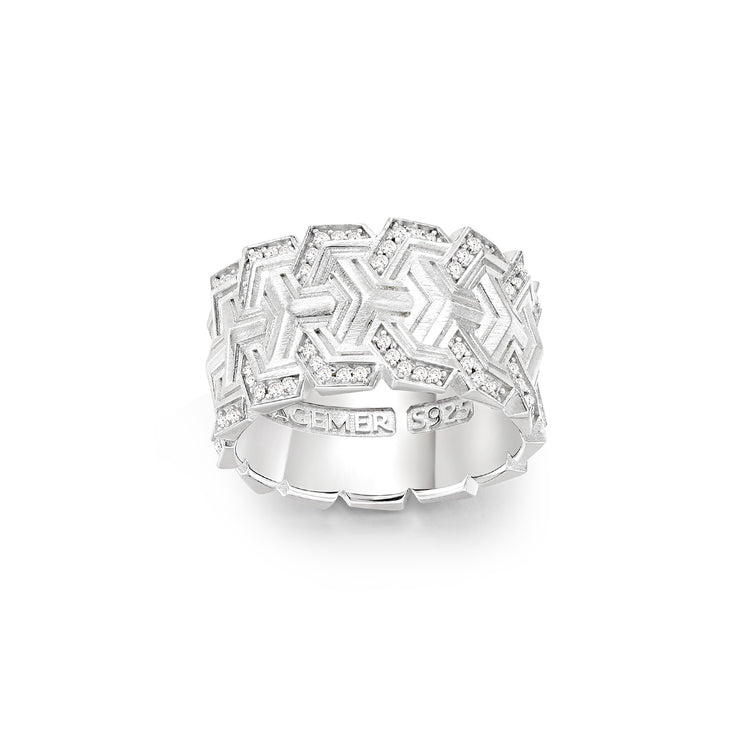 The Craft: Tiered Geometric Pavé Precision-engineered from Solid S925 Sterling Silver, the band features a unique triple-row tiered structure with deep-etched chevron patterns. The surface is treated with an industrial brush-matte finish to accentuate the architectural lines of the silver "plates". Each tier is hand-set with a triple-row pavé of brilliant-cut clear zircons, creating a seamless wall of light that contrasts against the rugged, weathered texture of the frame. The interior is finished with a high-polish silk-fit contour, ensuring that despite its wide 12mm profile, the ring remains comfortable for 24/7 wear.