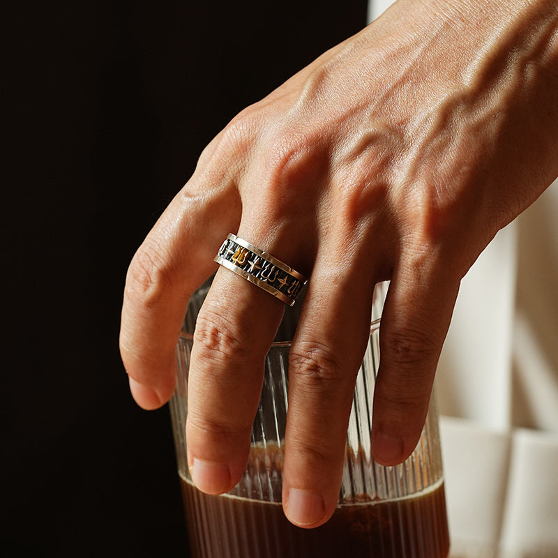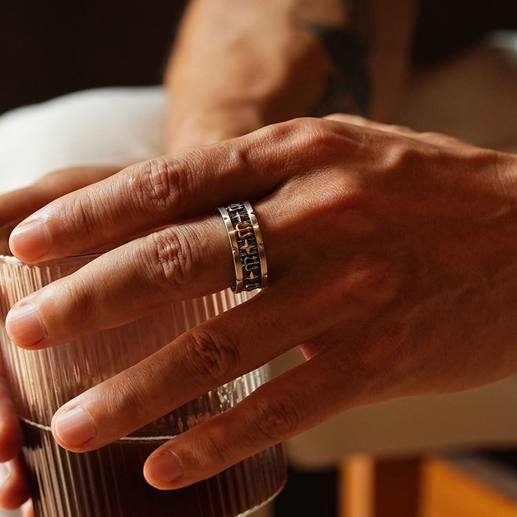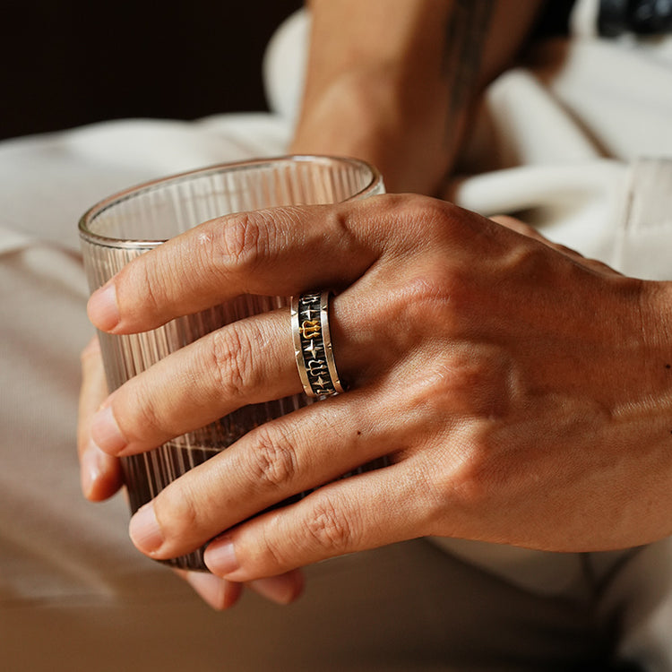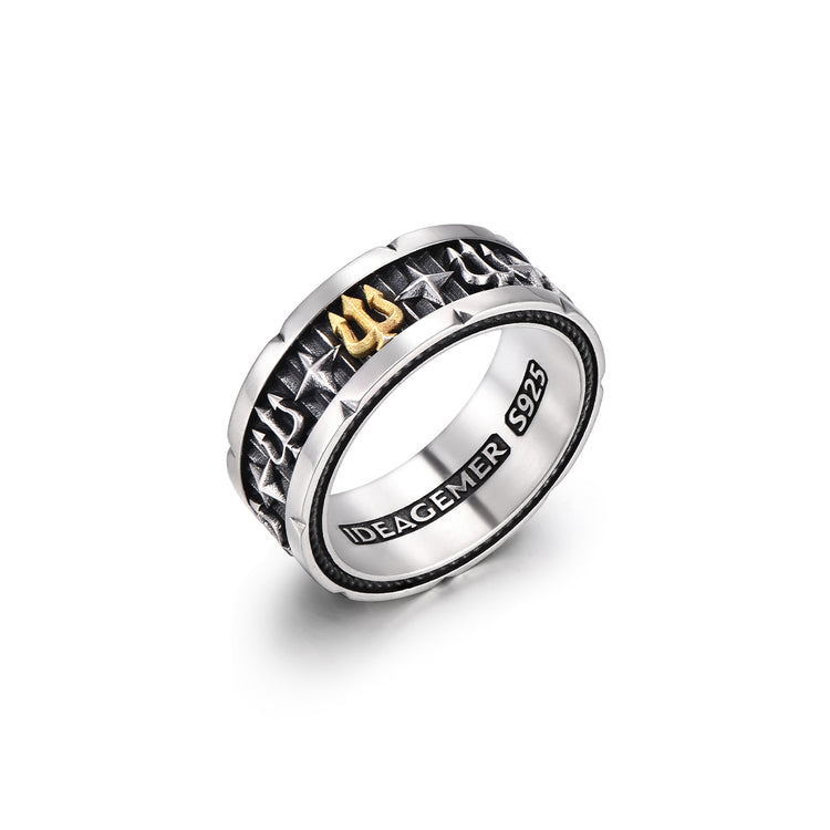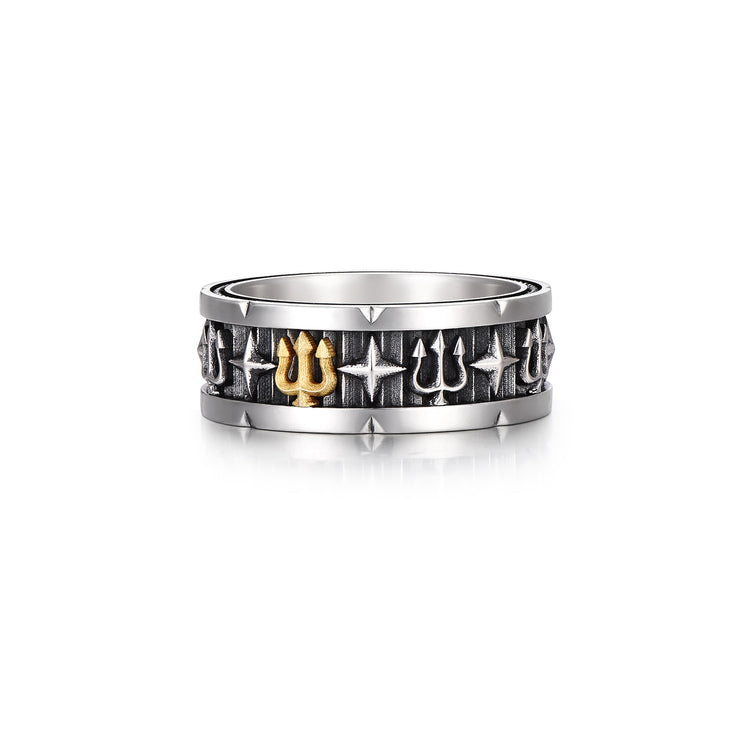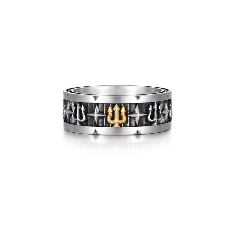 The Vintage Trident Ring Band draws inspiration from ancient warriors’ emblems. The trident, a timeless symbol of power and dominance, is paired with star-cross engravings to represent guidance and protection. Crafted in oxidized 925 sterling silver with a bold 24K gold vermeil centerpiece, this ring blends vintage artistry with modern masculinity — a statement of strength and individuality for men who lead with purpose.