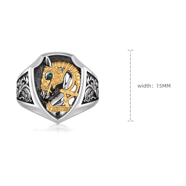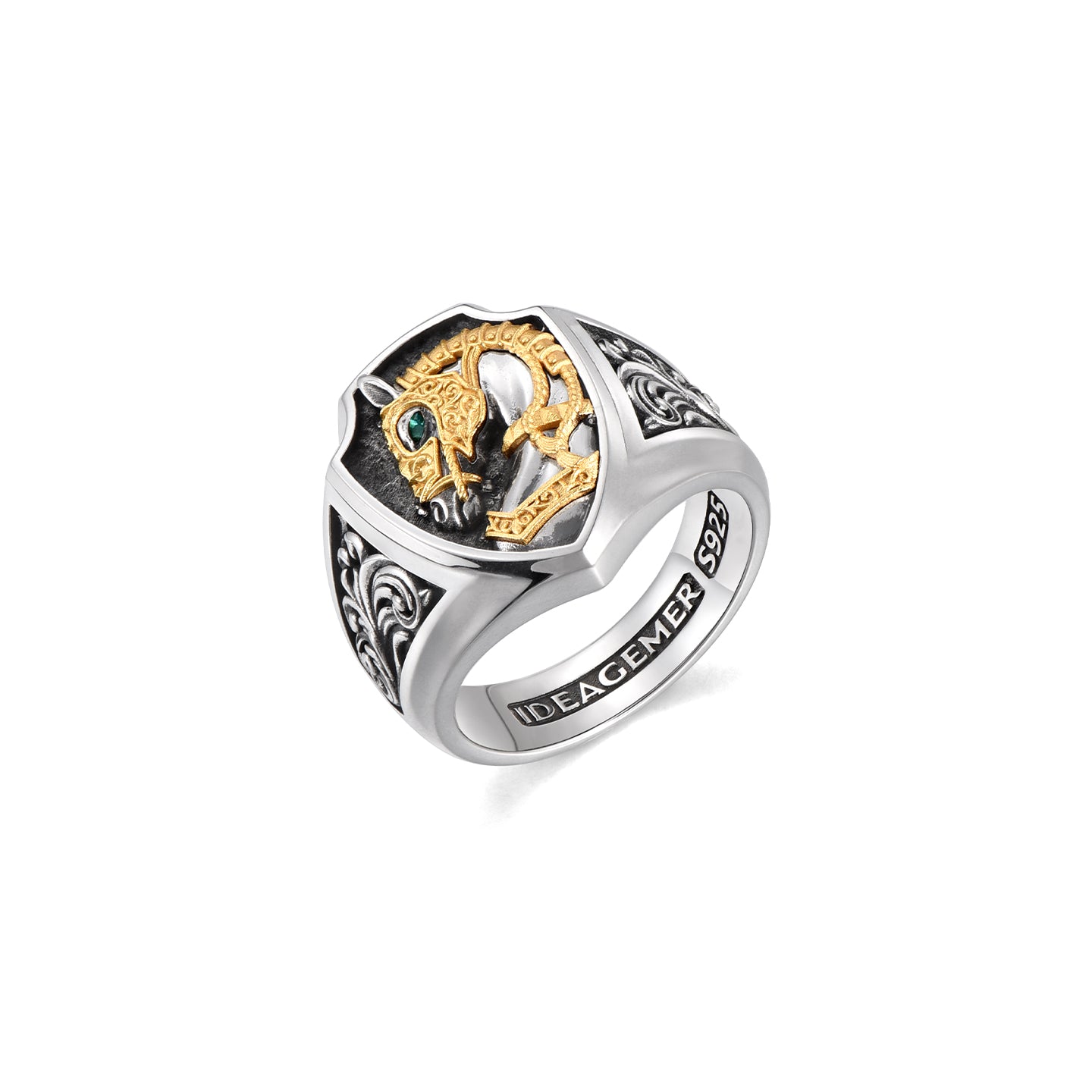 The Vintage War Horse Shield Ring is a signature creation within the IDEAGEMER War Horse Series, embodying the enduring symbolism of loyalty, courage, and unyielding strength. Inspired by knight heraldry, the ring features a sculpted gold-tone war horse motif set against a darkened shield backdrop. The piece is crafted in solid S925 silver, combining contrasting textures and finishes to amplify depth, dimension, and historical character.